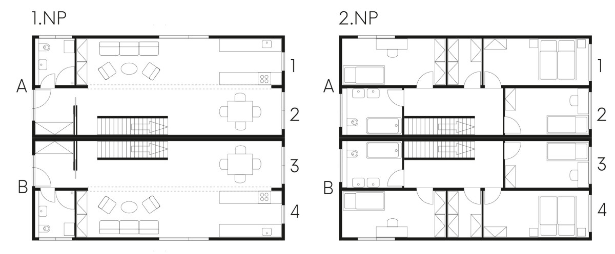 Pro zahraničního zájemce jsme zpracovali studii dvojdomku z osmi vyřazených lodních kontejnerů. Vzniknul návrh stavby v jednoduchém, základním tvaru kvádru, o půdorysu zhruba 9,5m na 12 metrů. Čtyři kontejnery sestavené podélně vedle sebe tvoří přízemí, čtyři ve stejné sestavě nad nimi první poschodí. Ještě nevíme, jestli se bude projekt v zahraničí realizovat, ale možná by mohl někoho oslovit. O detailní informace si případně pište na info@blokki.cz.
