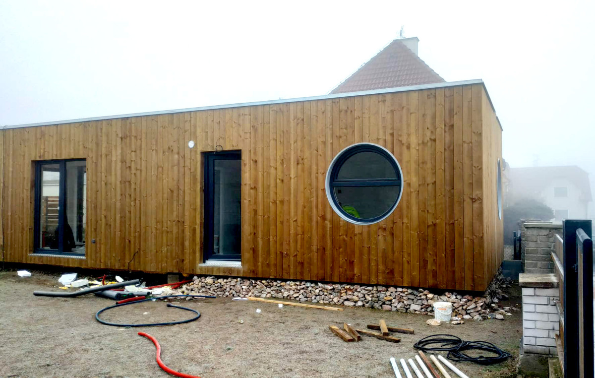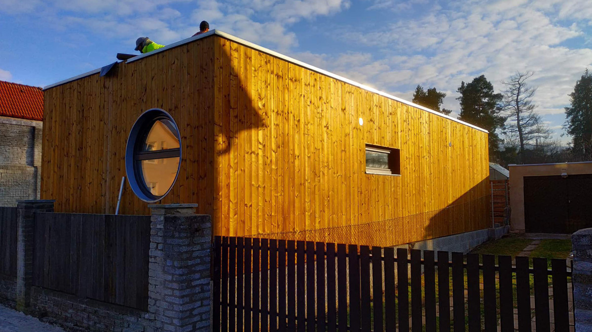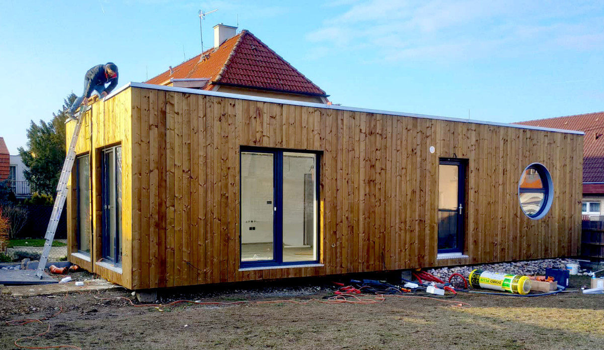Převezli jsme na pozemek tento dvou kontejnerový Blokki. Fotografie prezentují stav pár hodin po usazení. Domeček si zvyká na svůj nový pozemek. I když ráno ráno bylo v Praze mrazivé, technici celý den pilně pracovali na izolování a zakrytí spojů, svaření střešní folie a finalizaci všech detailů tak, aby se majitelé mohli za pár dní začít stěhovat.