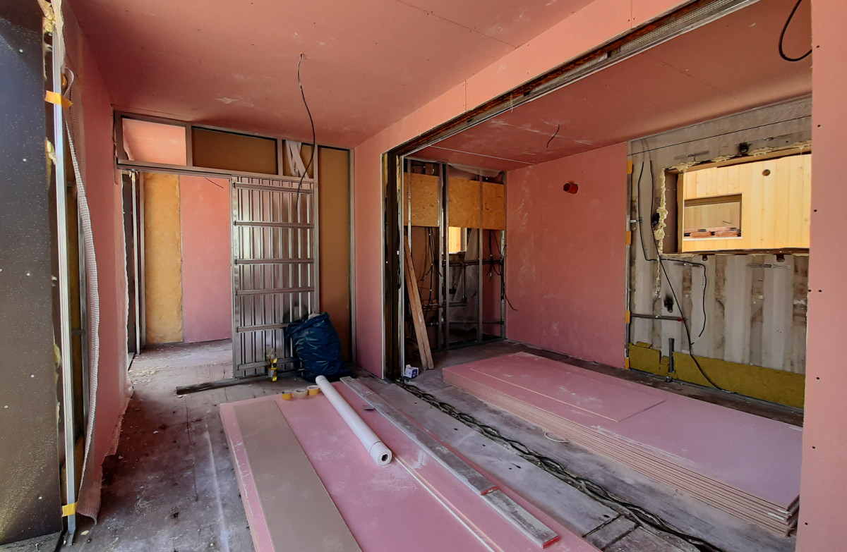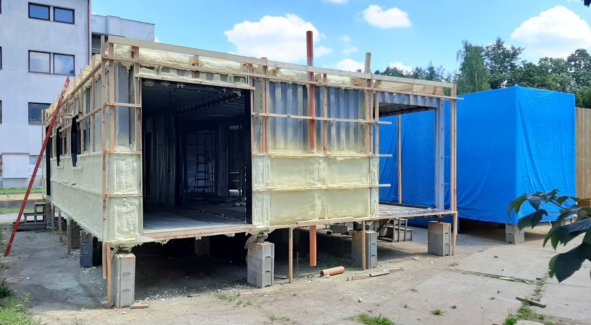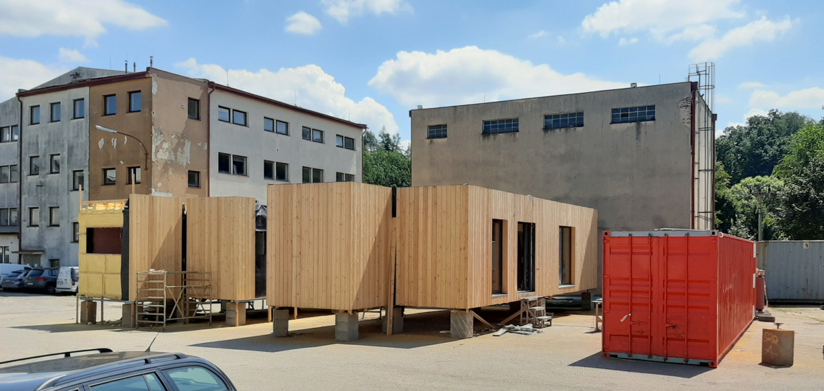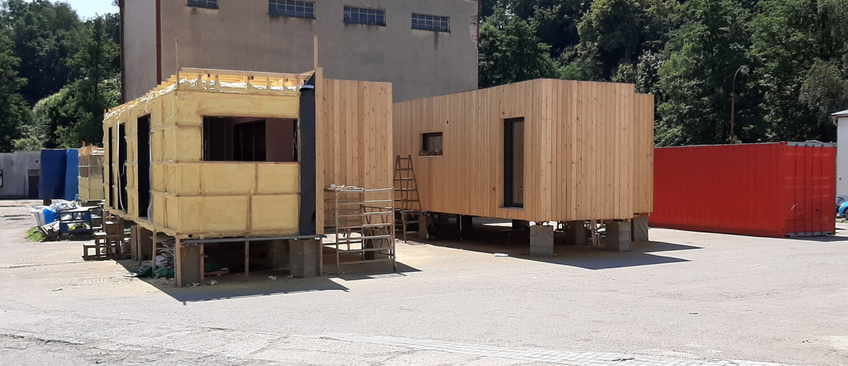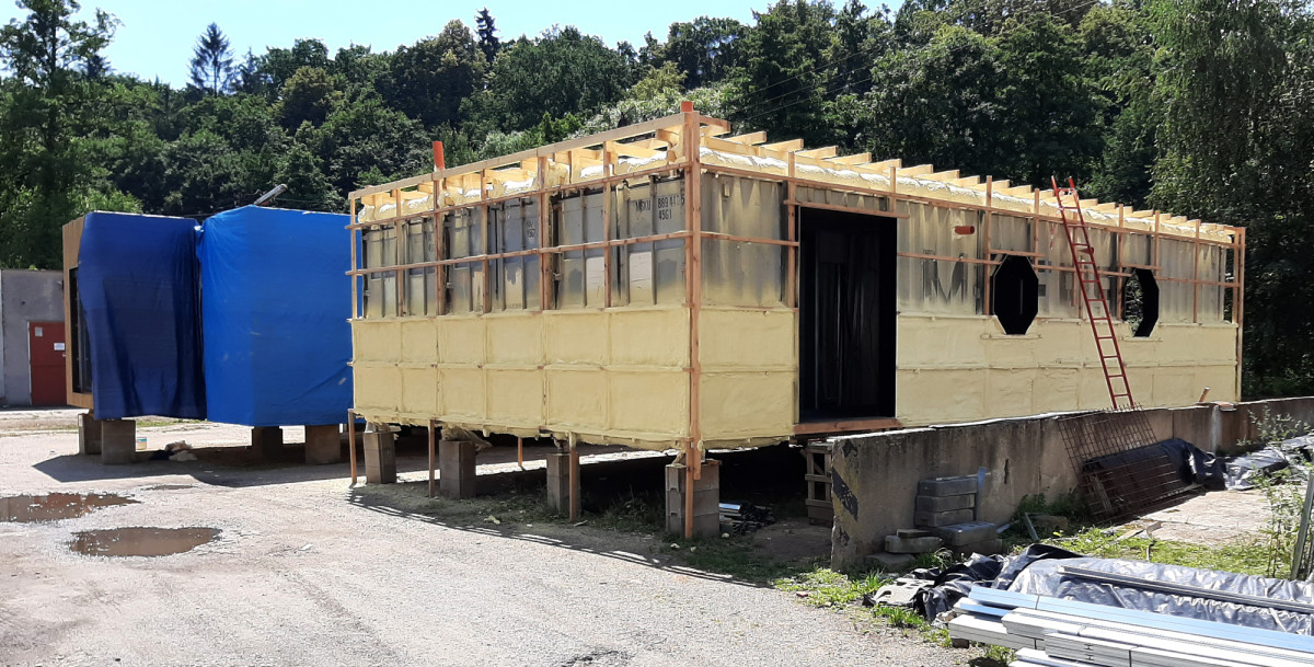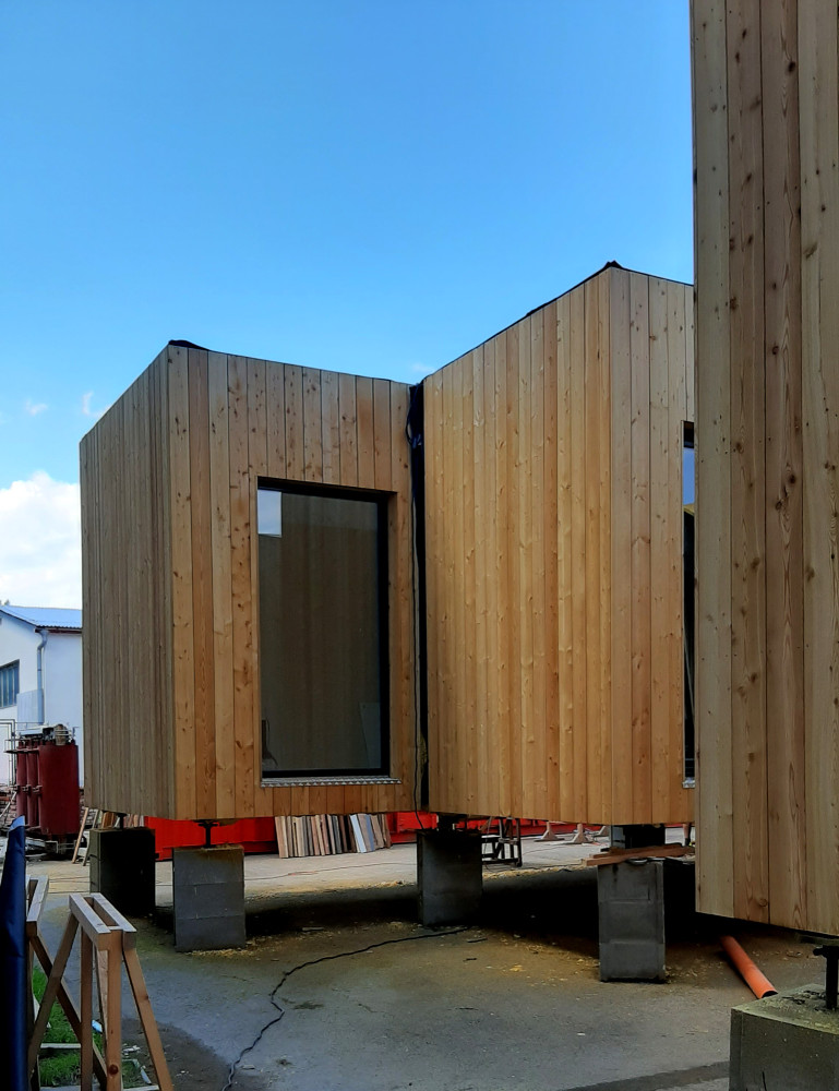 Vrchol léta v Blokki – v areálu pracujeme na čtyřech projektech. Z toho jsou to dva krasavci s modřínovou fasádou, oba typy 2blokki home S, jeden je s dřevěným obložením v interiéru, druhý ve standardu classic. Dále se rýsuje stavba ze tří lodních kontejnerů – oblíbený 2.5blokki home T se zastřešenou venkovní terasou. Zákazník zvolil kulatá okna s černými rámy do koupelny a do kuchyně, právě se na ně chystá konstrukce. Nyní je stavba v hrubé fázi, zvenčí se izoluje, uvnitř se chystají příčky. Máme tu i členitý 2.5blokki home S, tomu se zde budeme věnovat příště.