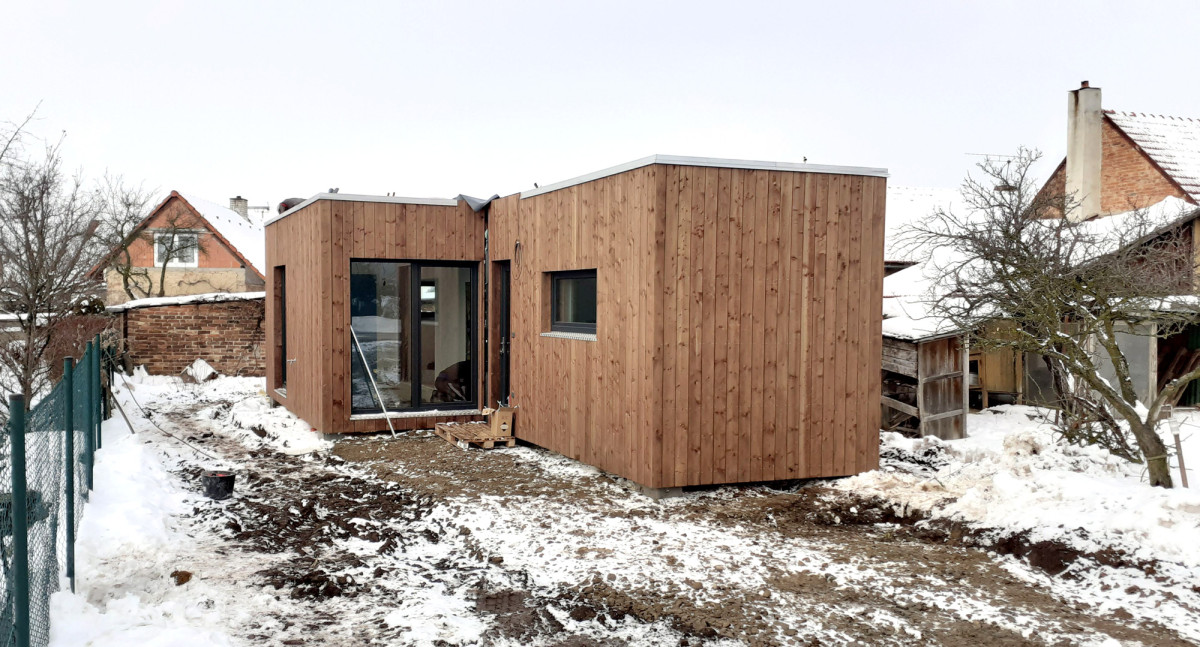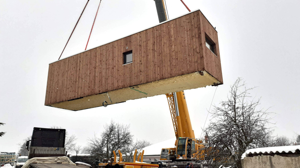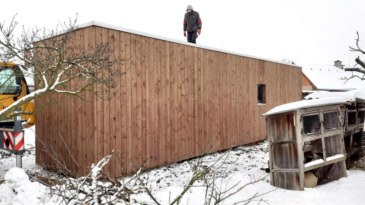 Další kontejnerový domek úspěšně usazen. Popravdě, tentokrát nám pomohly mrazivé dny. Půda na původně rozbláceném pozemku teplotami hlubokou pod nulou dobře ztuhla a jeřáb se mohl usadit v ideální pozici, transport proběhnul rychle a bez větších komplikací. Velký díl úspěchu je na profesionálním přístupu firmy Hanyš - Jeřábnické práce, kterým tímto děkujeme. Ve fotoreportu na prvním záběru stojí dům ještě u nás v areálu, ostatní snímky už jsou z kompletace na pozemku ve Středočeském kraji.