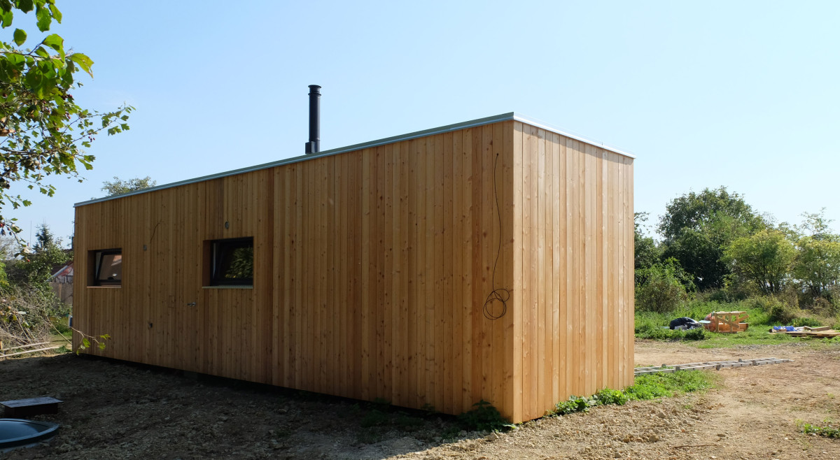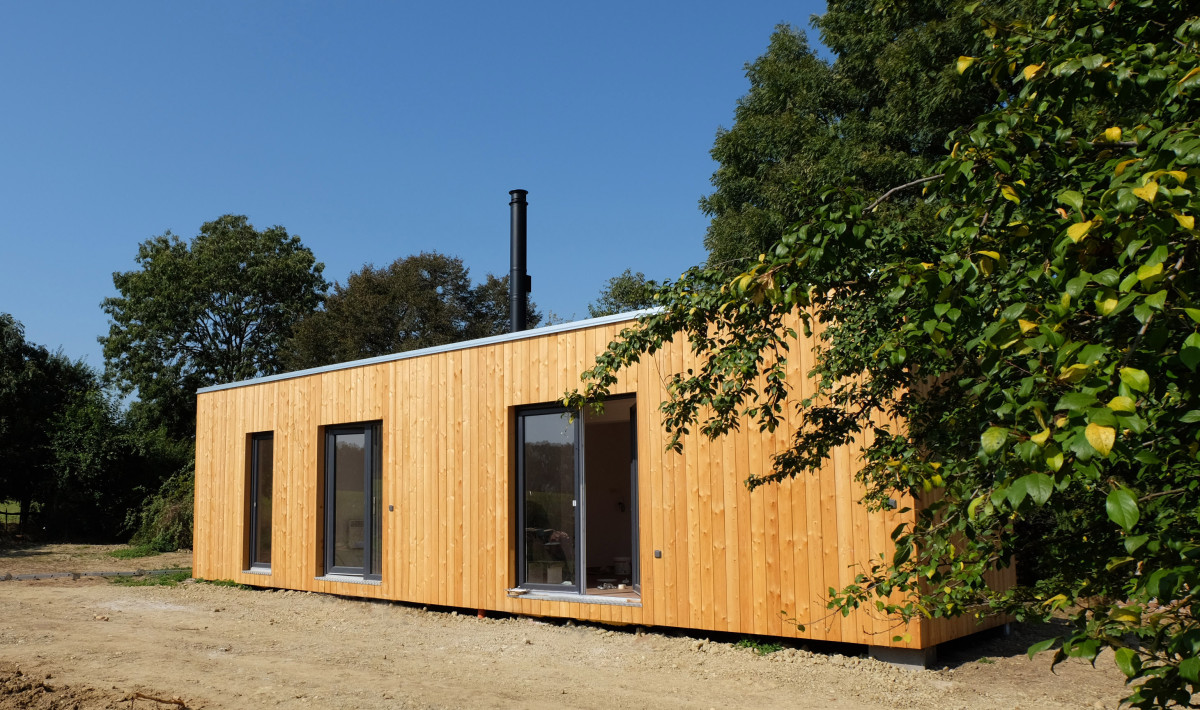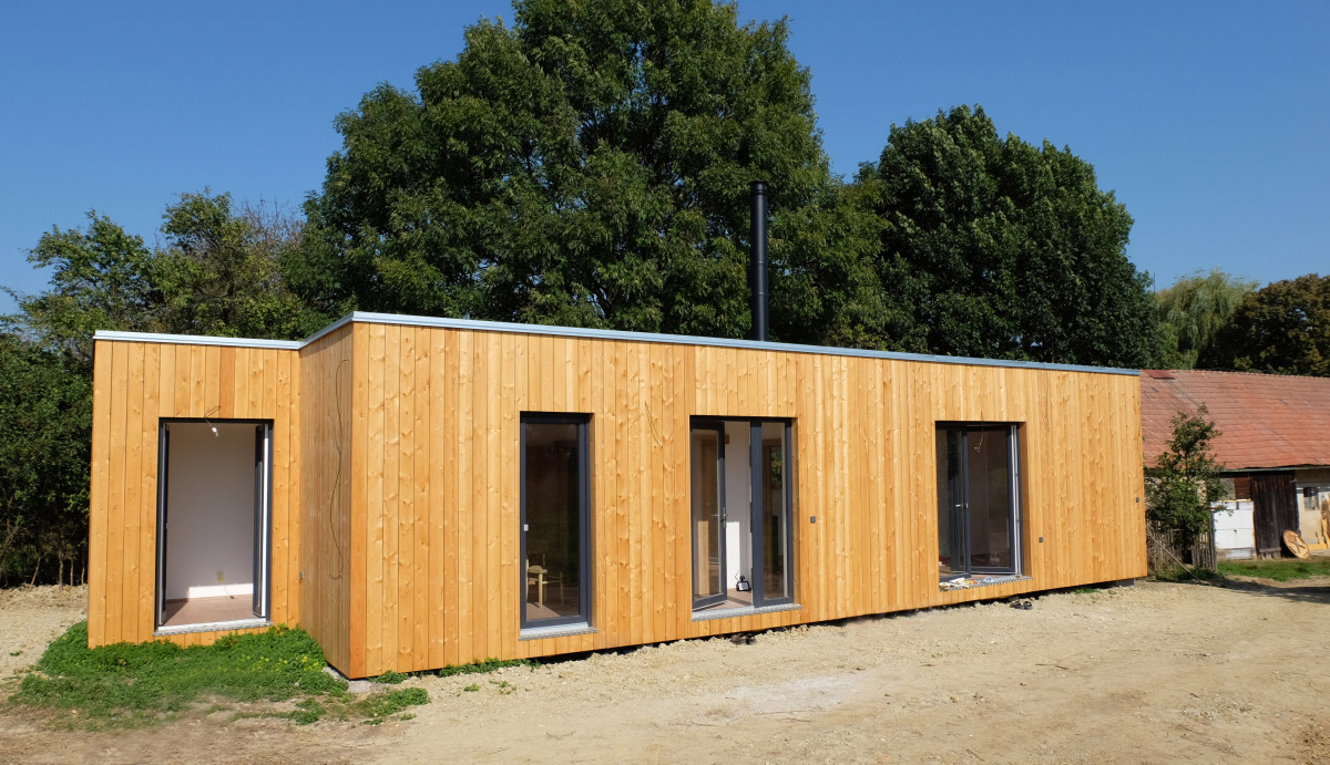 Oblíbená typová stavba s nosnou částí ze dvou lodních kontejnerů - 2blokki home S. V rámci klientských změn došlo k úpravě velikosti oken v hlavní obytné části a způsobu otevírání okna v ložnici, kde je systém štulp. Zastavěná plocha stavby 70, vnitřní užitná 52,5 m čtverečních, domek má vnitřní dispozici 3kk.