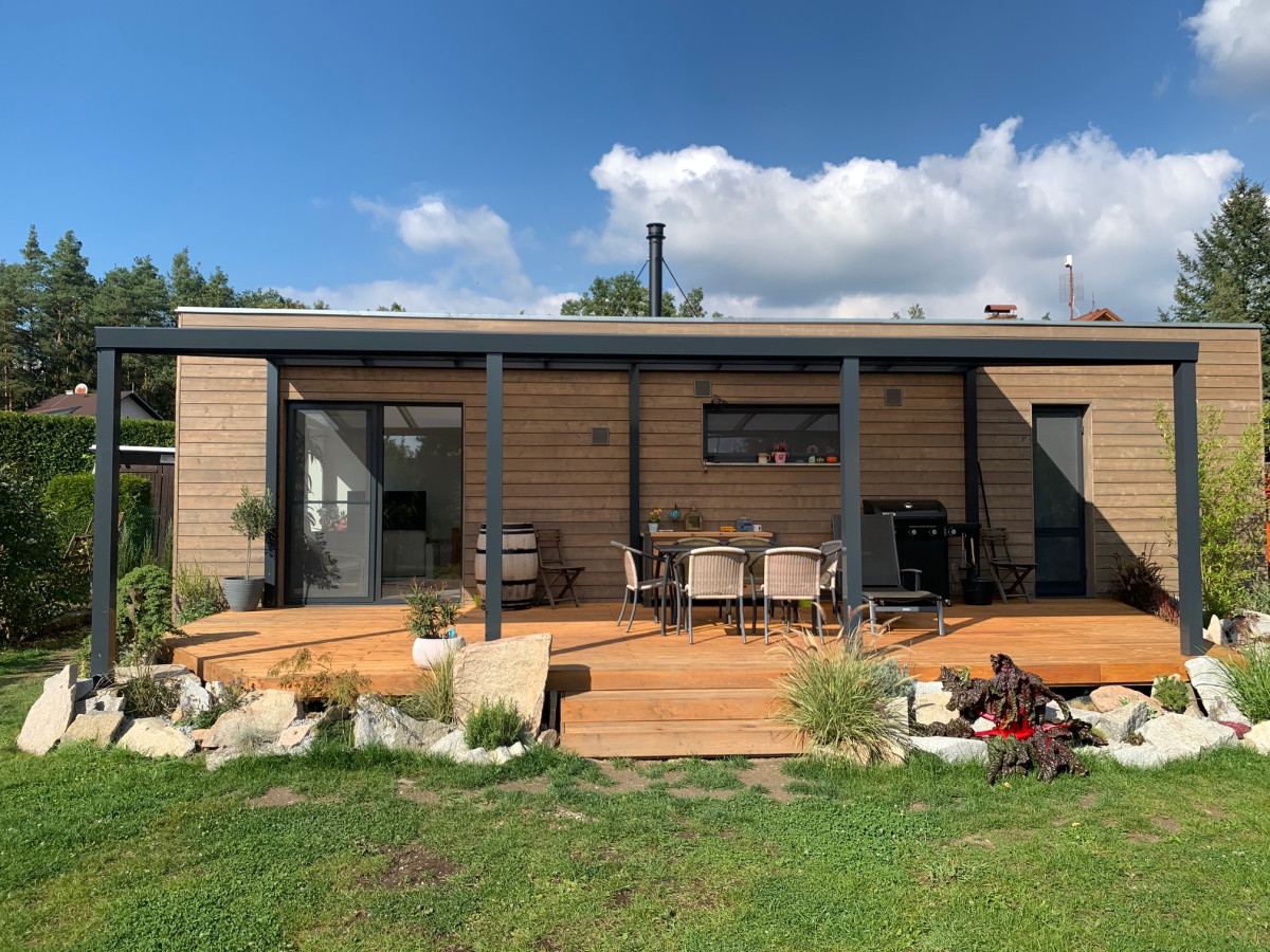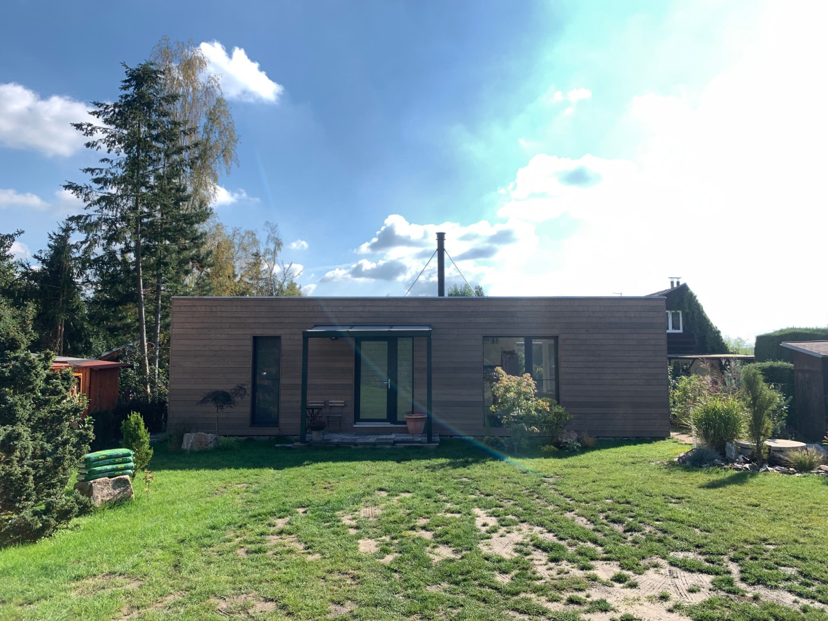 Stavba v reakreční oblasti slouží mladé rodině jako chata. Nosnou část tvoří 2 lodní kontejnery, spojené k sobě delšími stranami. Fasáda ze severského smrku má pro Blokki netypický horizontální klad, ošetřena je lazurou Adler v příjemném hnědošedém odstínu. Investor si chatu vkusně doplnil bytelnou pergolou.