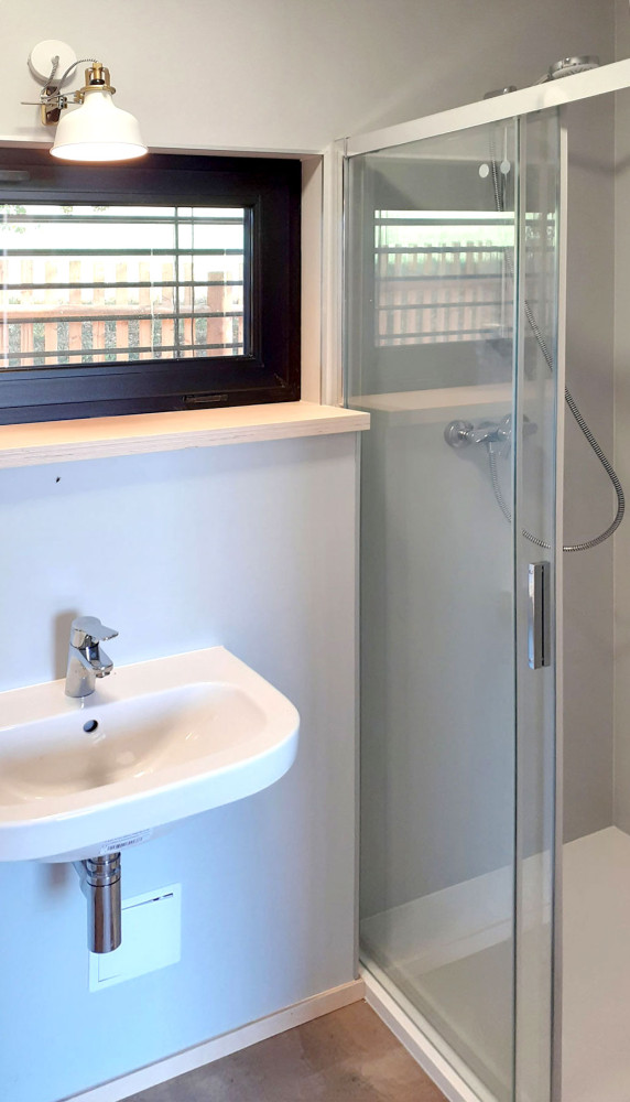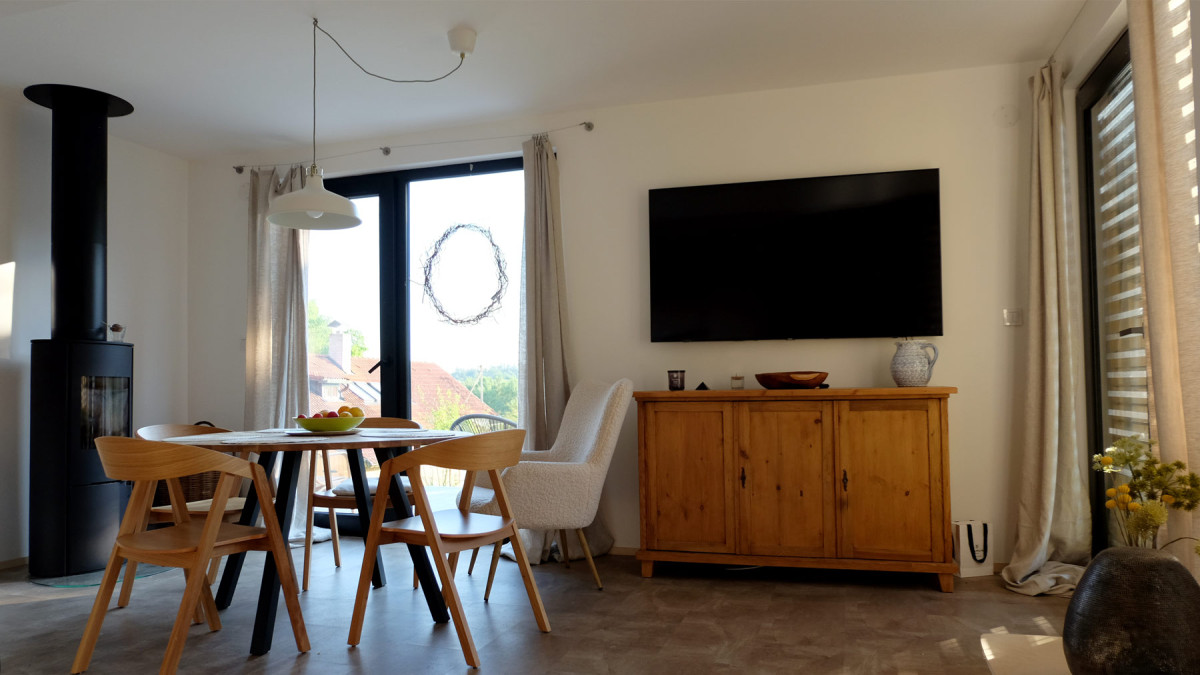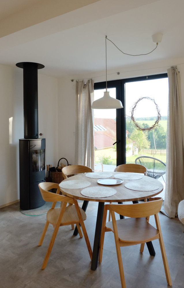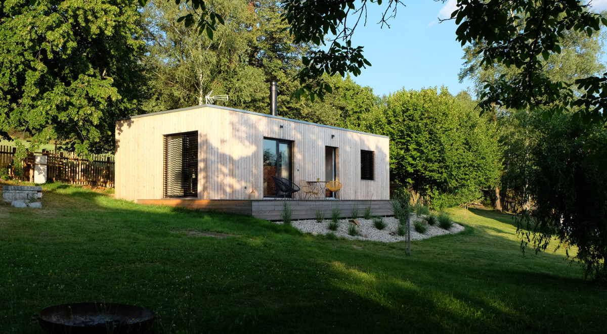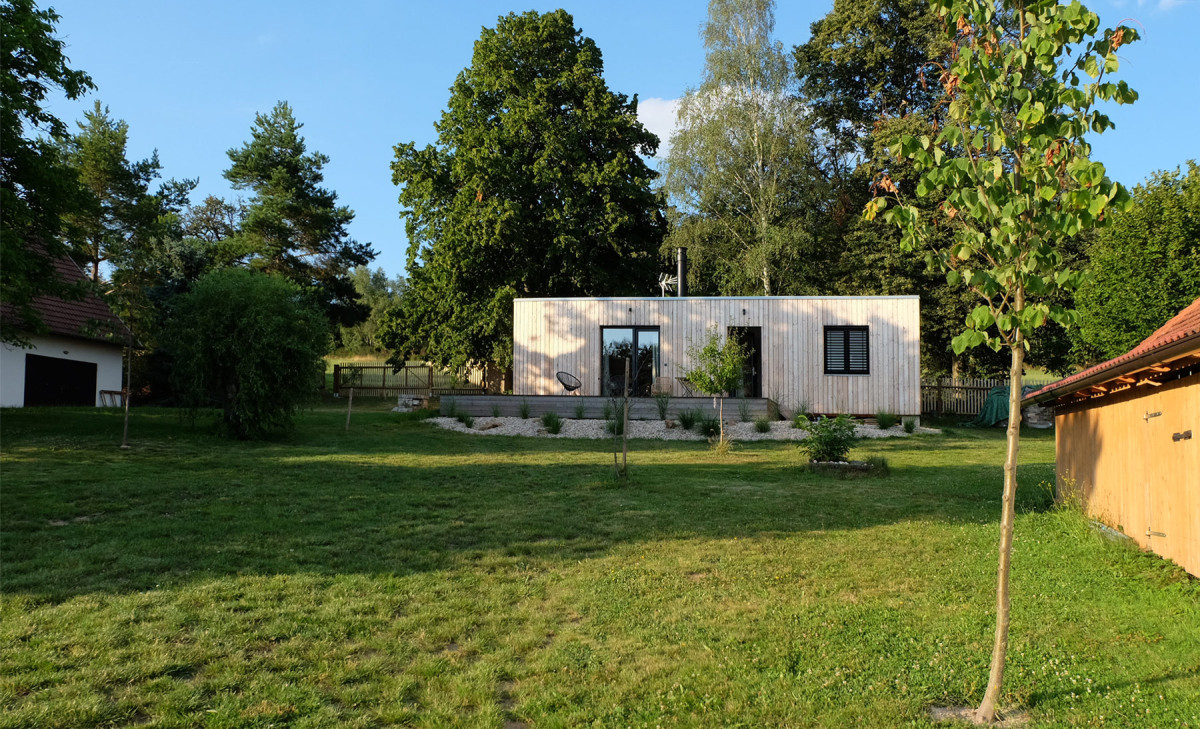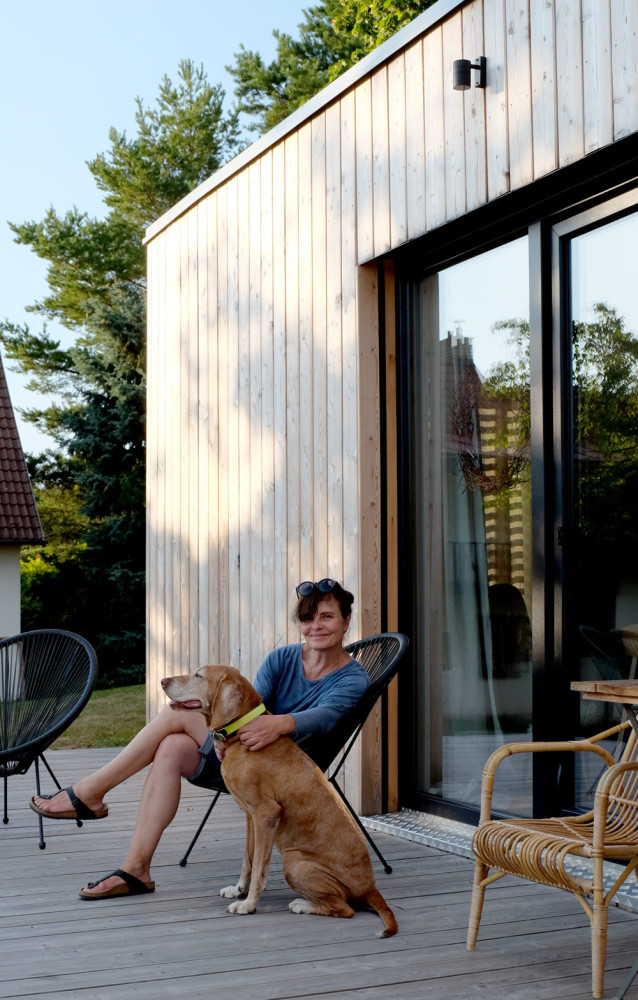 Na jaře 2021 nás oslovil herec a moderátor Jan Kraus s vizí zahradního domku pro jeho velkou rodinu. Spolupráce byla pro nás zajímavou výzvou, výbornou zkušeností i zábavou. Krausovi si vybrali náš typový domek 2blokki home C. Zpracovali jsme projekt, vyřídili povolení a již na konci srpna jsme stavbu na pozemek umístili. Na fotografiích je zachycen současný stav i spokojená uživatelka domku, paní Jana Krausová. Jana má výtvarné vzdělání a cit pro design. V interiéru, z větší části obloženém březovou překližkou, je její rukopis znát. Fasádu zdobí modřínový obklad a na přání investorů rozlehlá modřínová terasa. Oproti typové stavbě má chata odlišně rozmístěna okna v hlavní obytné části. Celá realizace, včetně vyřízení povolení, se podařila zvládnout v rekordně krátké době pěti měsíců.