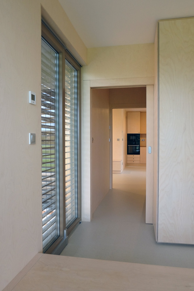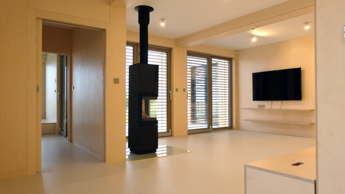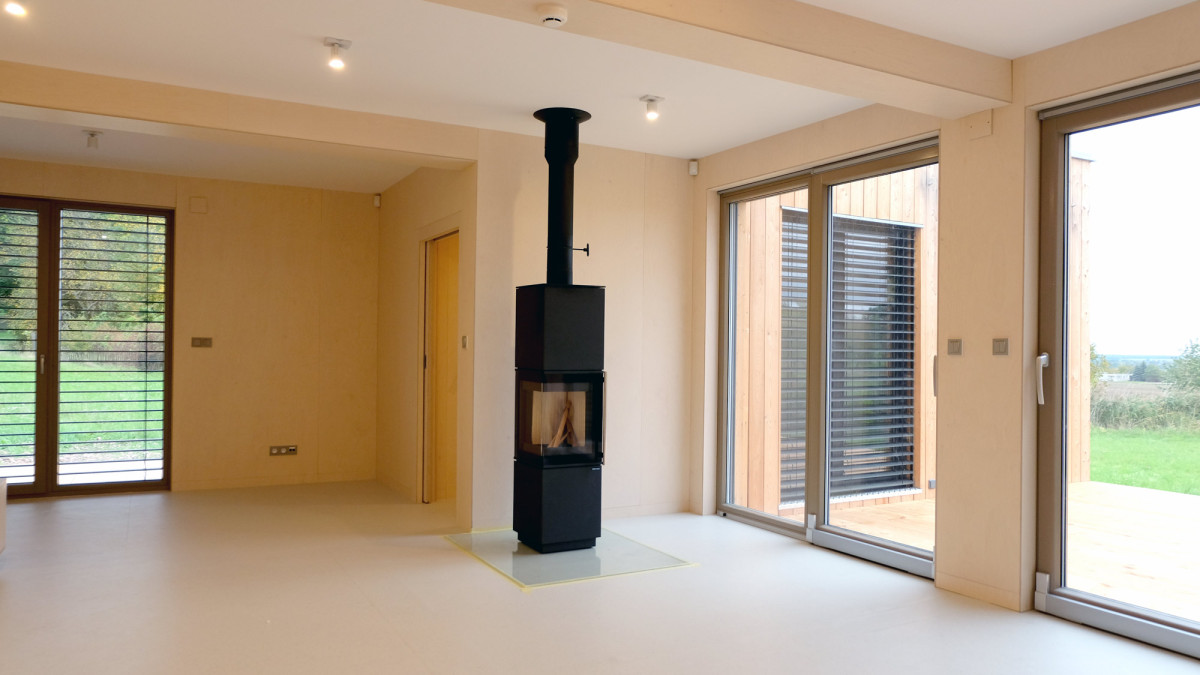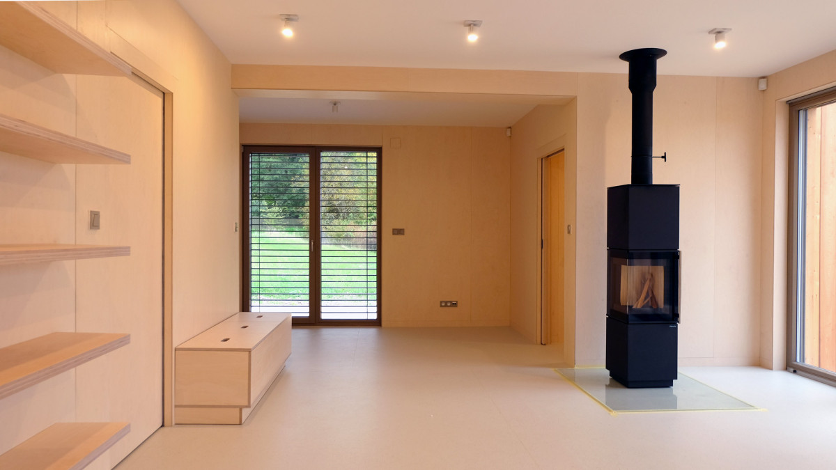 Stavba 3blokki home v provedení design, které u nás znamená především interiér obložený dřevem. Objednala si jej u nás mladá rodina na svůj ne zcela rovný pozemek, proto je přední část na vyvýšených patkách.