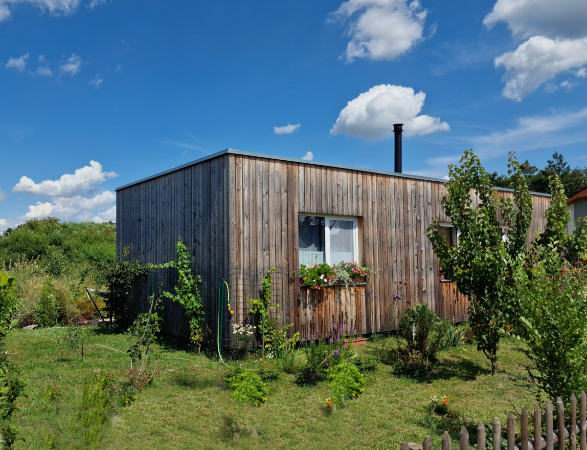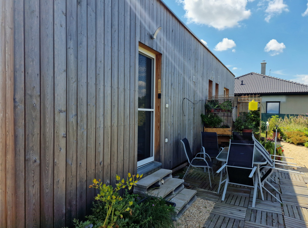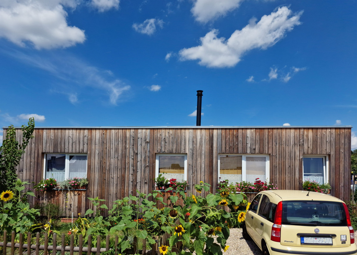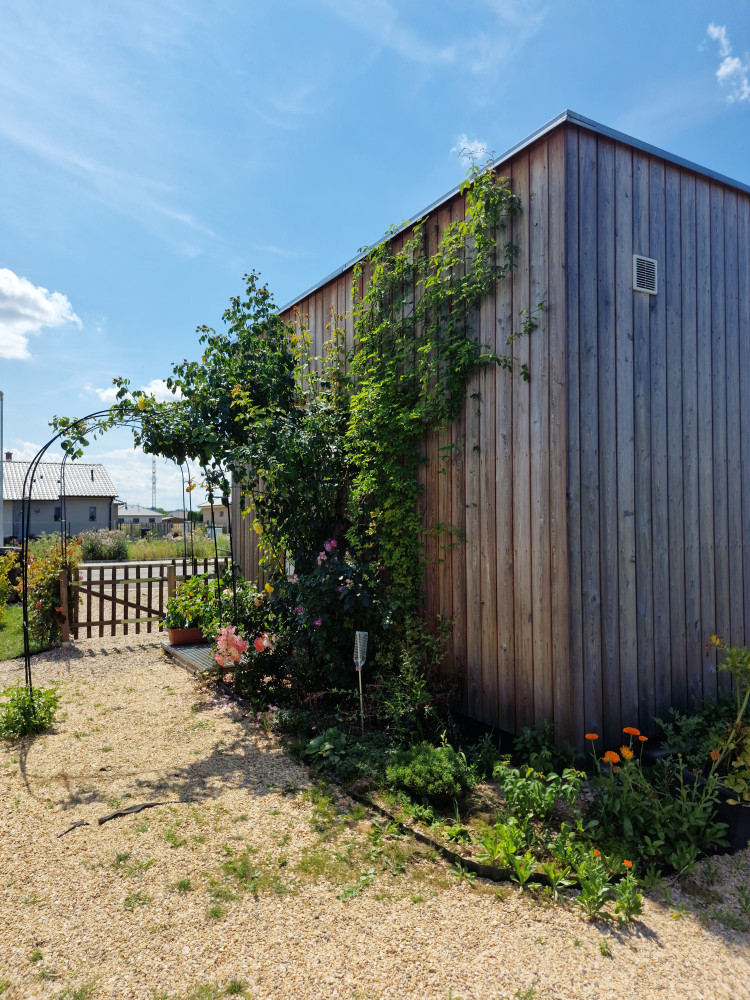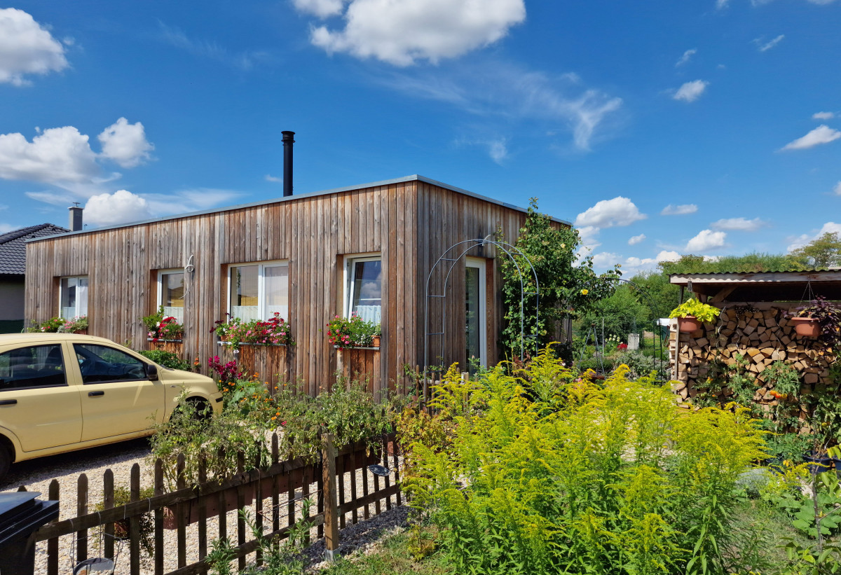 2blokki home na trvalé bydlení. Stavba ze dvou lodních kontejnerů s vnitřním uspořádáním dle individuálního zadání klientky. Majitelka miluje květiny, přáním byla menší okna směrovaná do ulice s parapety, které ponesou květinové truhlíky. Modřínová fasáda bez exteriérové lazurace je ideální pro ty, kteří si přejí bezúdržbový povrch a líbí se jim postupné zešednutí modřínu. Fotografie byly pořízeny po 4 letech od realizace stavby.