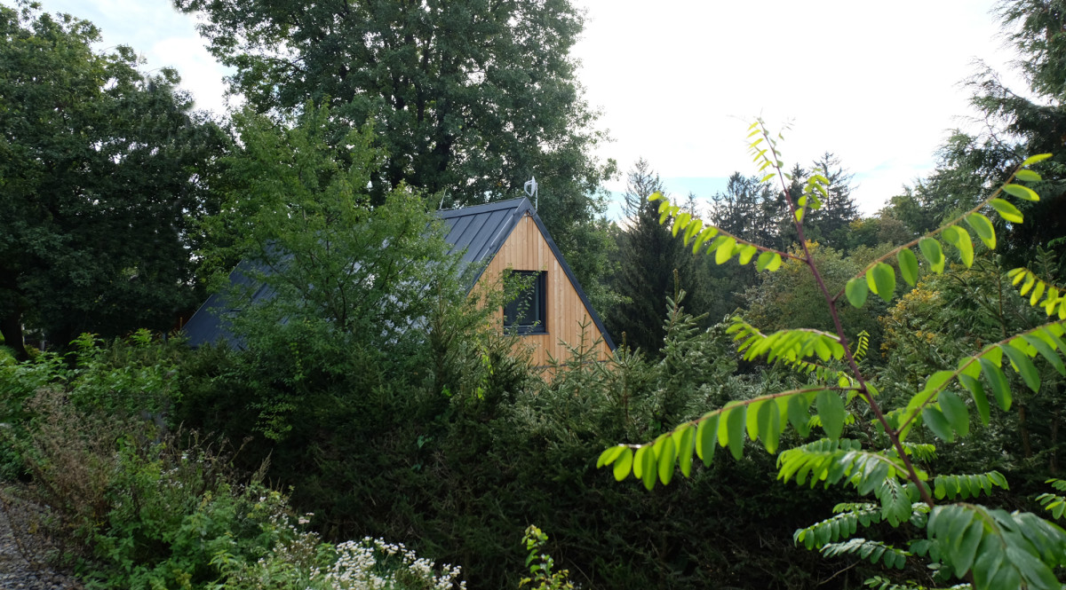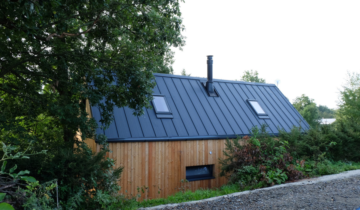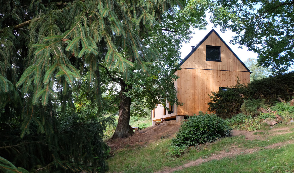 Stavba s kombinovanou technikou. Nosnou konstrukci přízemní části tvoří dva lodní kontejnery, střecha z dřevěných vazníků je klasická dřevostavba realizovaná až po usazení kontejnerů na pozemek. Na konci roku 2021 jsme se domluvili na spolupráci. Přes zimu a jaro jsme domek naprojektovali a vyřídili jeho stavební povolení. Na začátku června 2022 jsme se domluvili na smlouvě o dílo. Samotná realizace trvala 4 měsíce. Svažitý pozemek je z větší části porostlý bujnou vegetací a vzrostlými stromy. Naší maximální snahou bylo zeleň zachovat. Více o této typové stavbě zde.