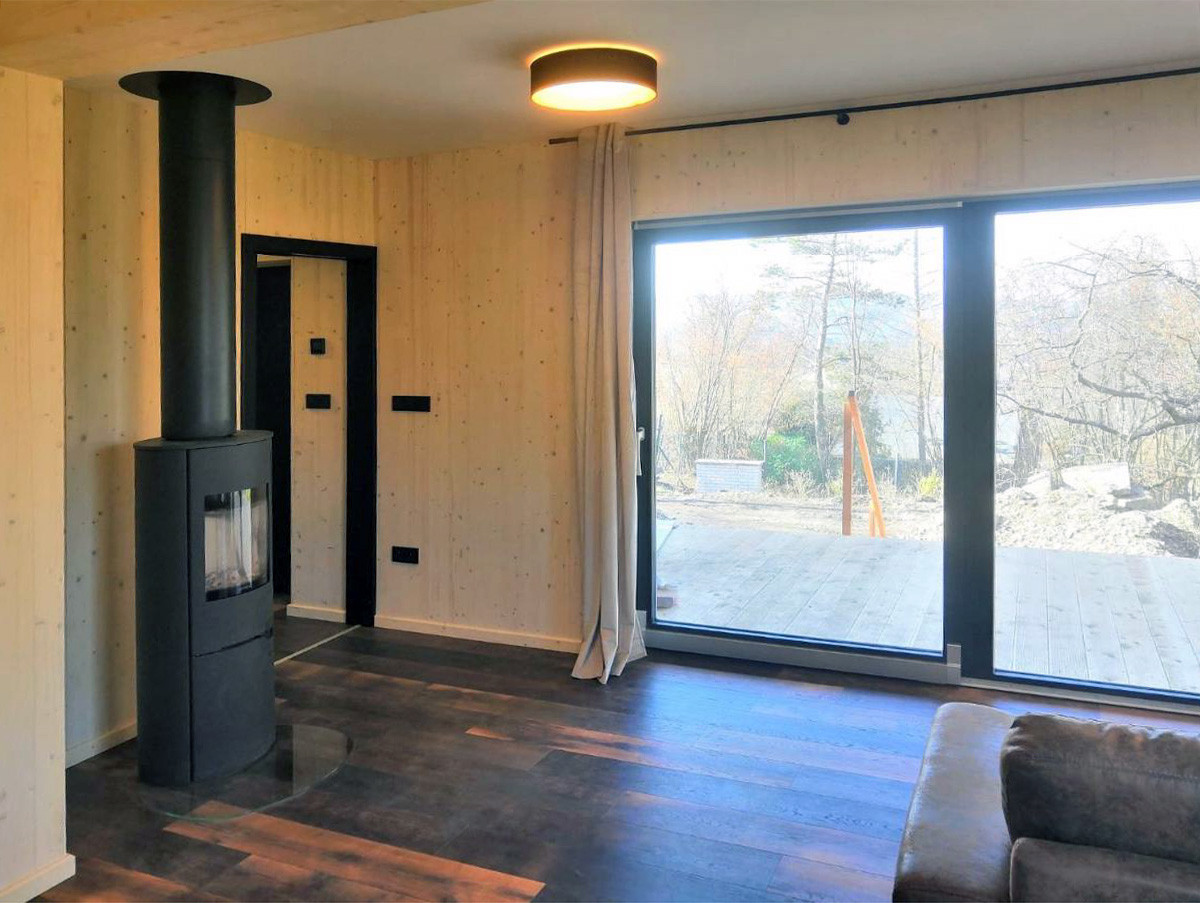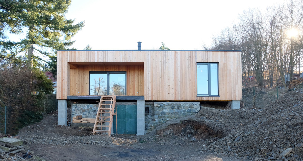 Manželé před pár lety koupili starou chatku na menším svažitém pozemku, v krásné rekreační oblasti poblíž soutoku Sázavy s Vltavou. Chatku odstranili, ale starý bytelný sklep zachovali. Nad něj si od nás nechali postavit moderní dům s nosnou částí ze tří lodních kontejnerů, typový 2.5blokki home T. Půdorys odpovídá typové stavbě. Klientské změny zahrnovaly: otočení půdorysu o 180°, přidání a zvětšení vybraných oken. Stavba má zastavěnou plochu 100 m², obytnou plochu 80,6 m² (včetně zastřešené terasy), vnitřní dispozici 3kk. Fasádu zdobí sibiřský modřín. Interiérové stěny jsou obloženy smrkovou spárovkou. Topení elektrické podlahové kombinované s krbovými kamny. Stavba slouží pro krátkodobé pronájmy i jako naše ukázková referenční stavba. V případě zájmu si u nás rezervujte prohlídku pomocí kontaktního formuláře.