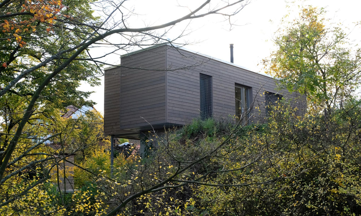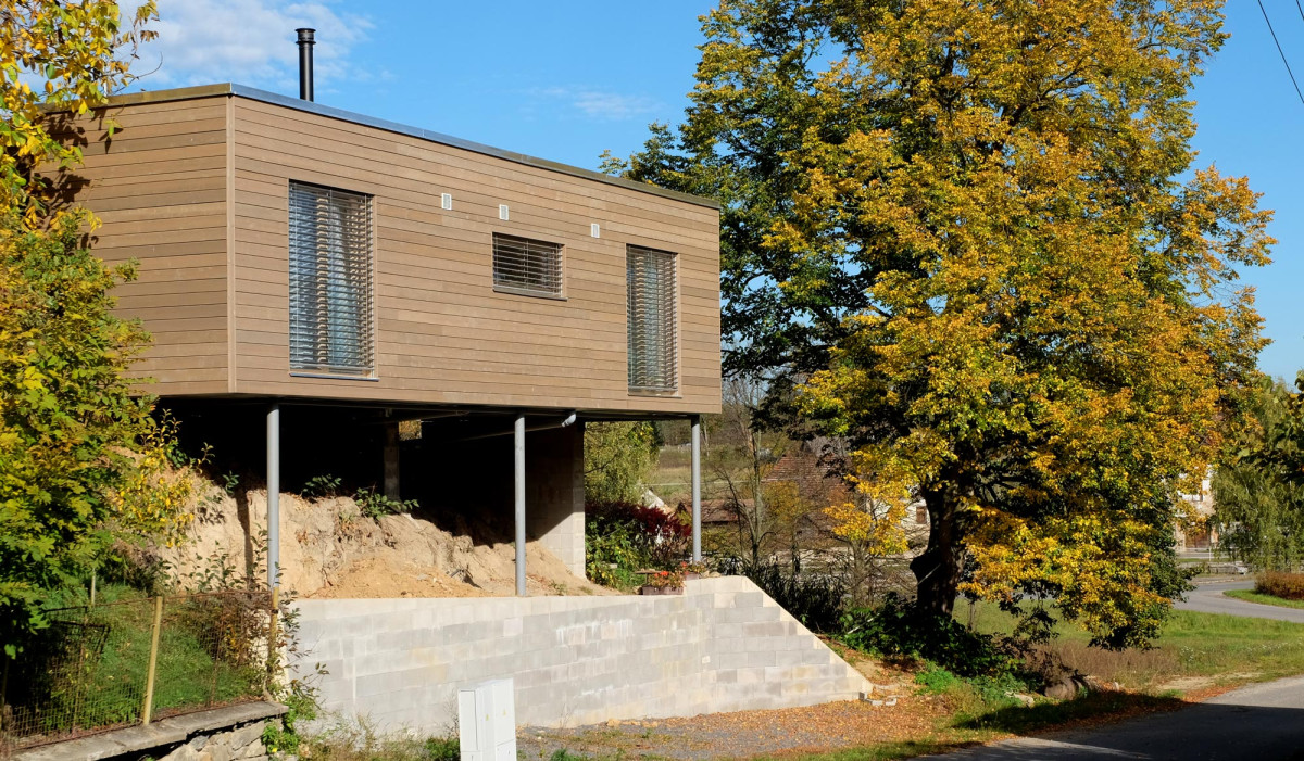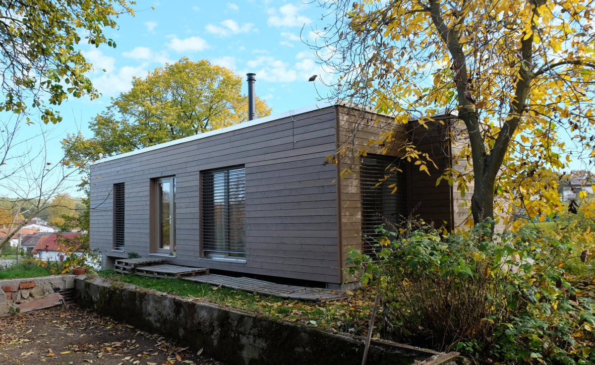 Stavba ze dvou kontejnerových konstrukcí umístěná na malém a velmi svažitém pozemku. Dům v provedení design, s dřevem obloženým interiérem, je z celé jedné poloviny vynesen na vysokých kovových sloupech. Součástí naší dodávky byly zemní práce, jako základové patky, biočistírna odpadní vody a zemní vrt.