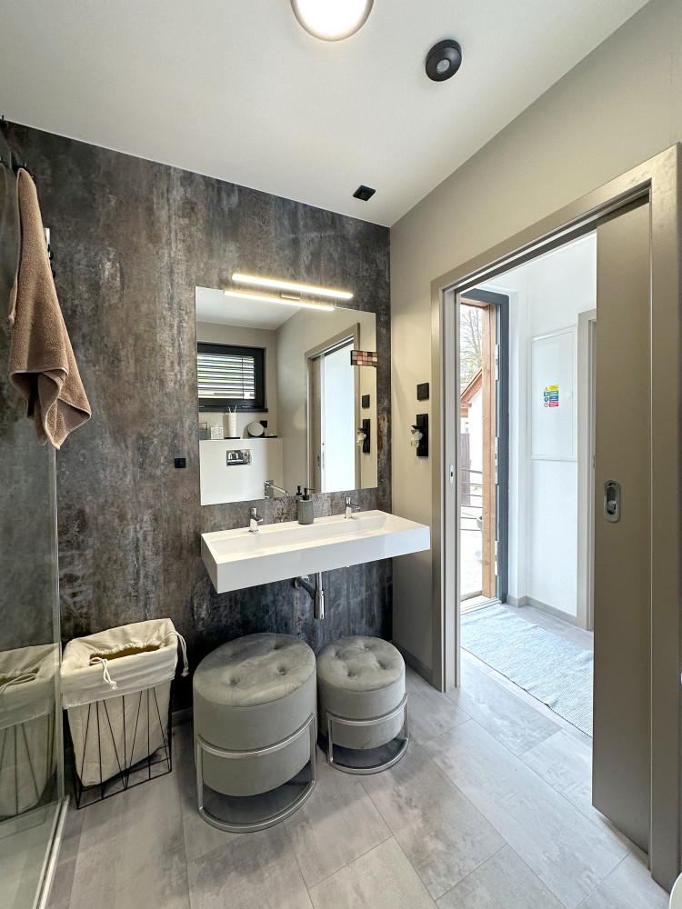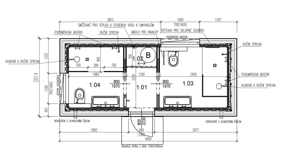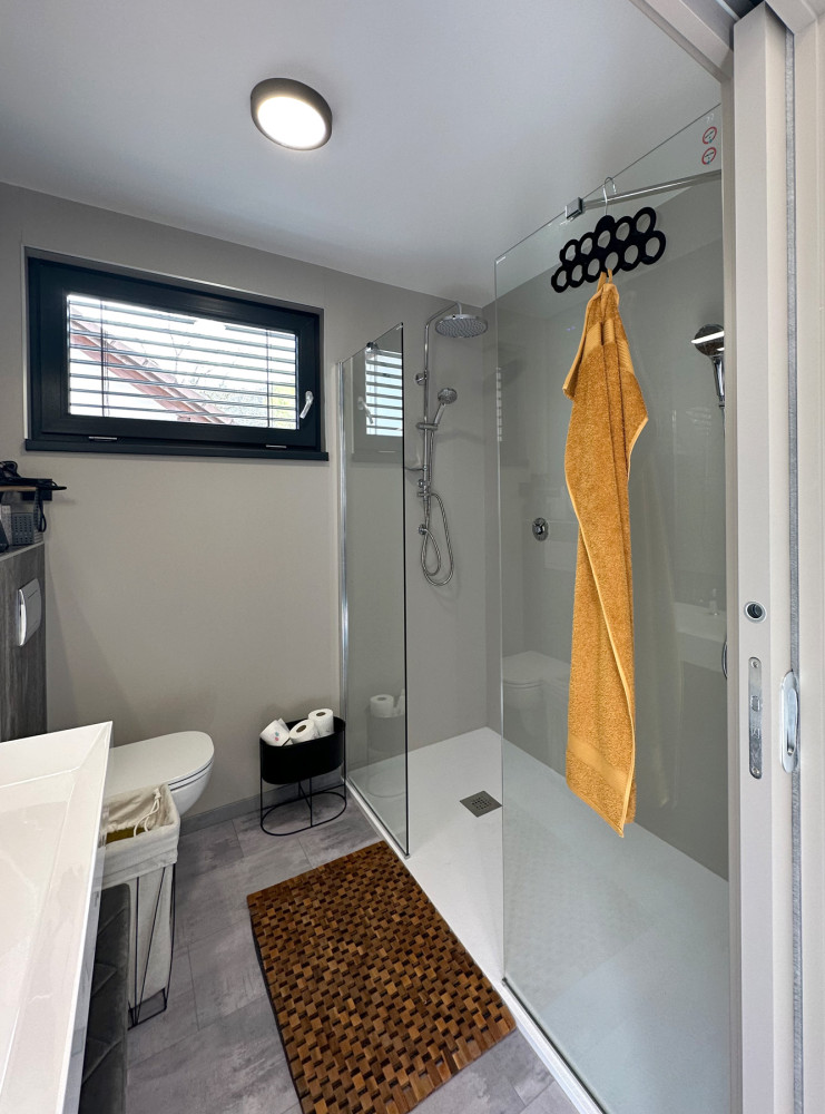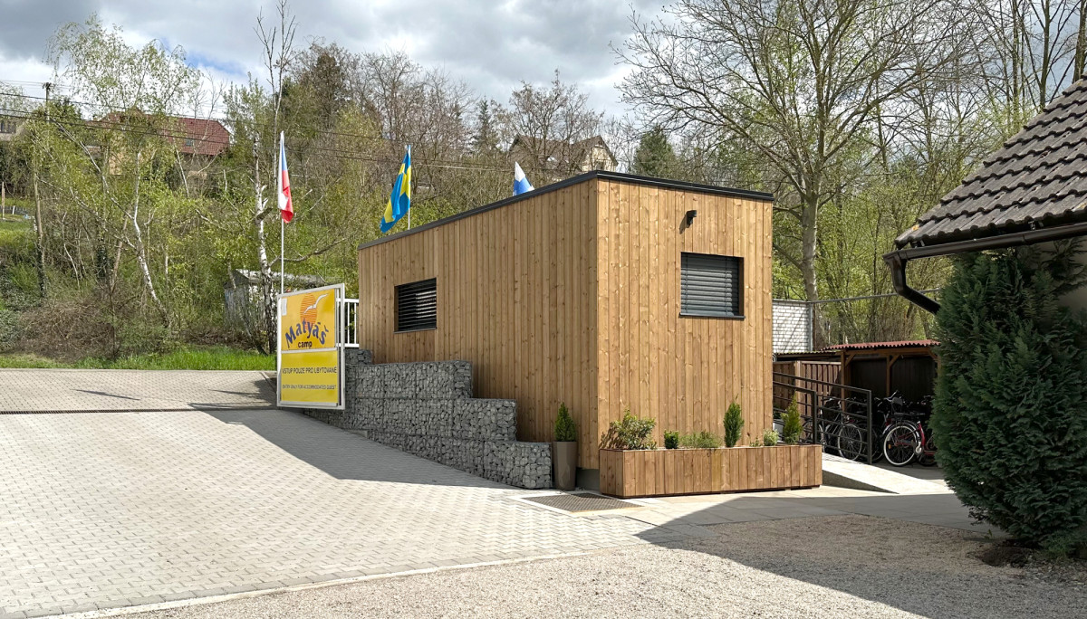 Specialitka – tak by se dala definovat zakázka, kterou jsme na jaře 2023 dokončili ve Vraném nad Vltavou. Oslovili nás majitelé tamního kempu se zadáním výstavby modulu s bezbariérovou koupelnou ve vyšším standardu. Výsledkem je stavba s nosnou konstrukcí z jedné poloviny lodního kontejneru, která obsahuje dvě luxusní koupelny (z nichž jedna je bezbariérová), malé zádveří a vestavnou skříň ukrývající bojler. Kemp navštěvují převážně rodiny s dětmi, proto jsou sprchové kouty dostatečně prostorné a pohodlné. Pojmou najednou celou rodinu. Stěny jsme obložili prémiovým deskovým vinylem Kronospan Rocko Wall, což je výborná alternativa klasických keramických kachliček. Majitelům Camping Matyáš děkujeme za velice příjemnou spolupráci.