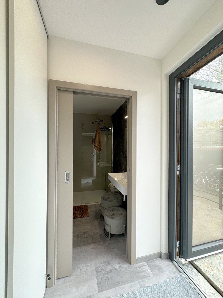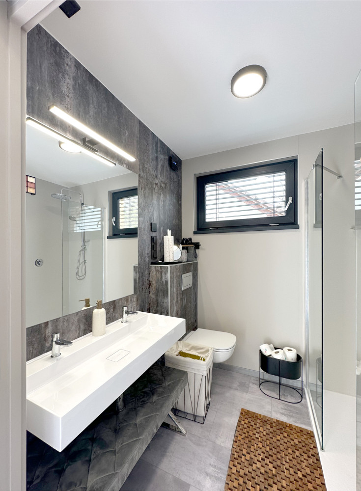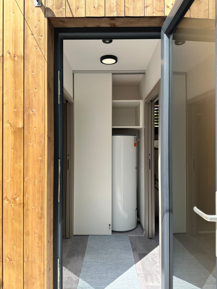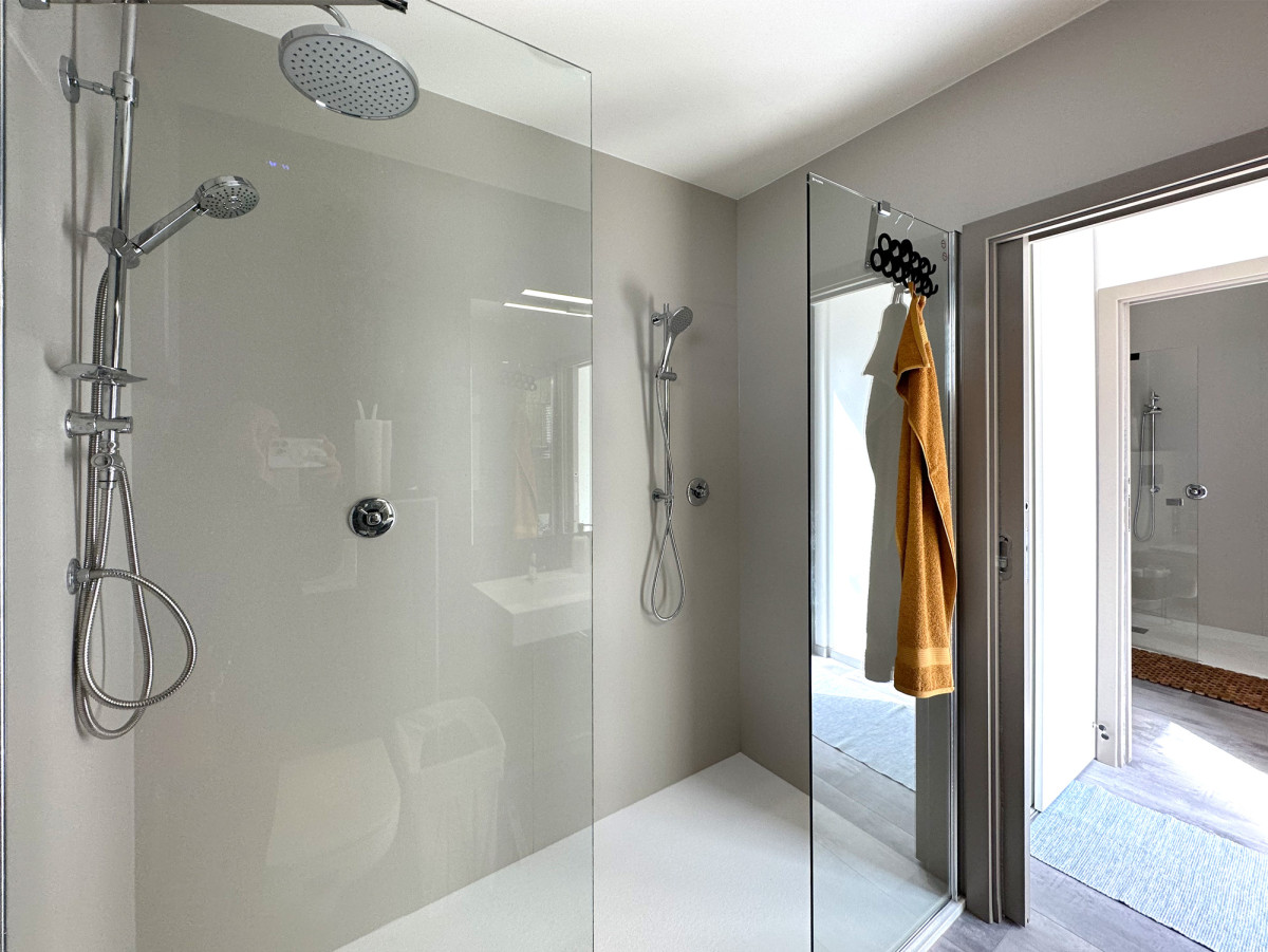 Specialitka – tak by se dala definovat zakázka, kterou jsme na jaře 2023 dokončili ve Vraném nad Vltavou. Oslovili nás majitelé tamního kempu se zadáním výstavby modulu s bezbariérovou koupelnou ve vyšším standardu. Výsledkem je stavba s nosnou konstrukcí z jedné poloviny lodního kontejneru, která obsahuje dvě luxusní koupelny (z nichž jedna je bezbariérová), malé zádveří a vestavnou skříň ukrývající bojler. Kemp navštěvují převážně rodiny s dětmi, proto jsou sprchové kouty dostatečně prostorné a pohodlné. Pojmou najednou celou rodinu. Stěny jsme obložili prémiovým deskovým vinylem Kronospan Rocko Wall, což je výborná alternativa klasických keramických kachliček. Majitelům Camping Matyáš děkujeme za velice příjemnou spolupráci.