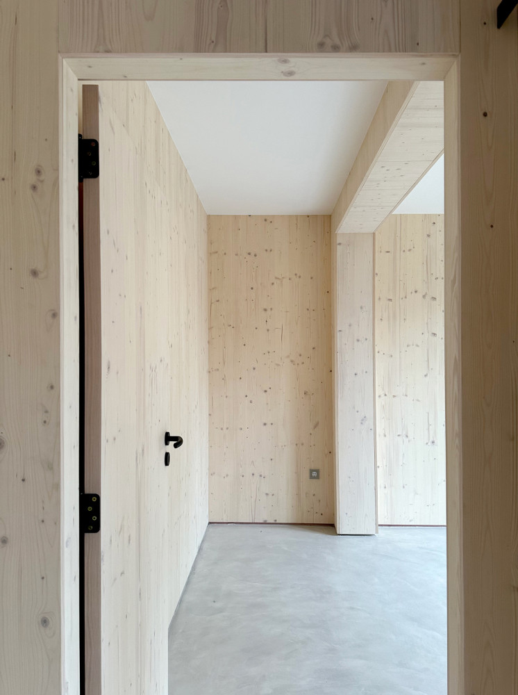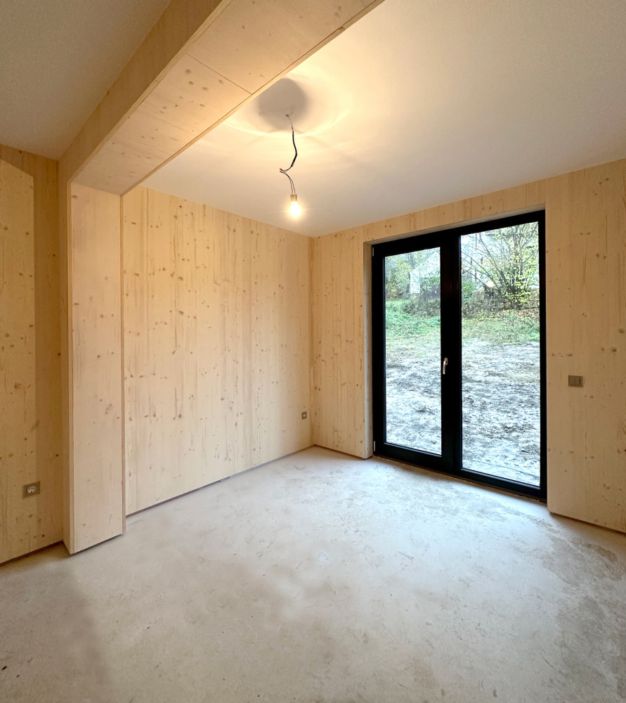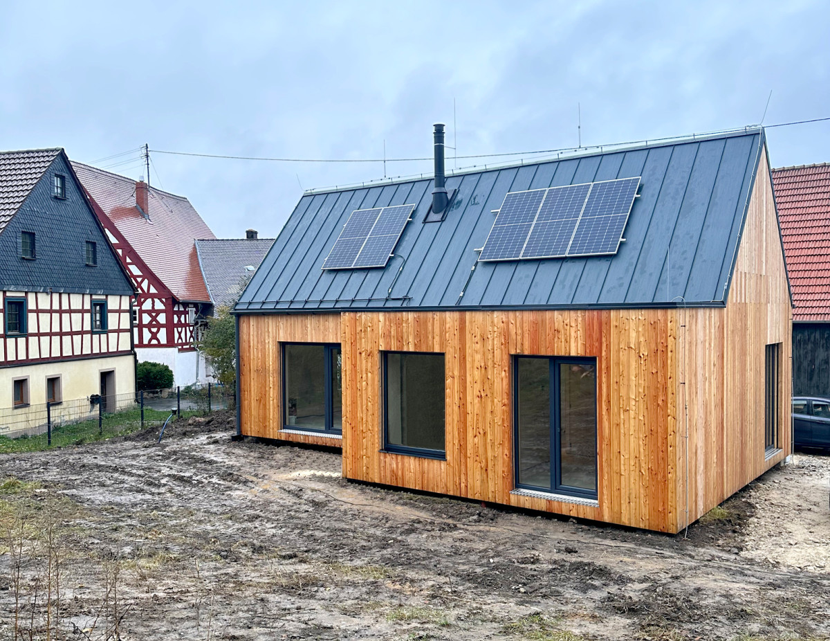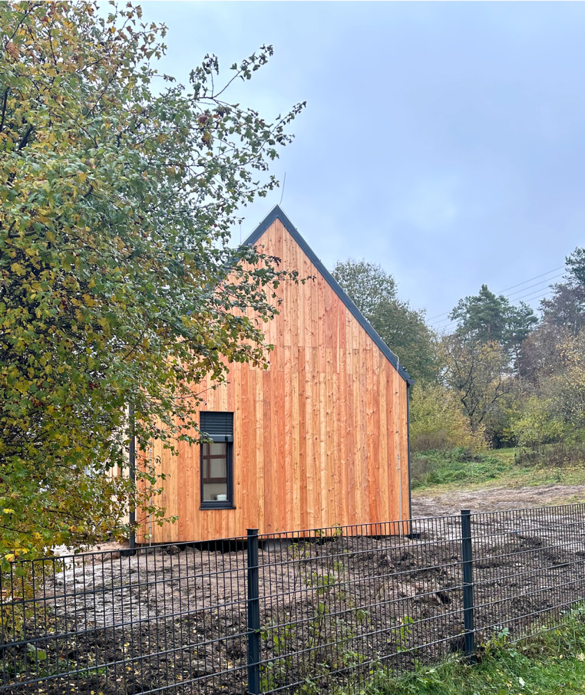 V Bavorsku, v malé vsi zhruba 30 km severně od Norimberku, jsme ve druhé polovině 2023 realizovali dům o velikosti dvou a půl modulů. Půdorys vychází z naší typové stavby 2.5bloki home B. Pozemek o výměře cca 650 m2 je svažitý, podloží skalnaté. Místní regulativ je poměrně přísný a neumožňuje stavbu s plochou střechou. U typové stavby nevyhovovala orientace vstupních dveří přes terasu. Na základě požadavků klientky a omezení týkajících se pozemku jsme proto navrhli zásadní úpravy typové stavby. Co se týká interiéru, hlavním přáním klientky bylo zvětšení dvou ložnic, oddělená pracovna a situování hlavního vstupu směrem k přístupové cestě. Všechny tyto požadavky se nám podařilo splnit, s výsledkem je naše zákaznice nad míru spokojená. Dům opticky harmonizuje s okolní zástavbu.