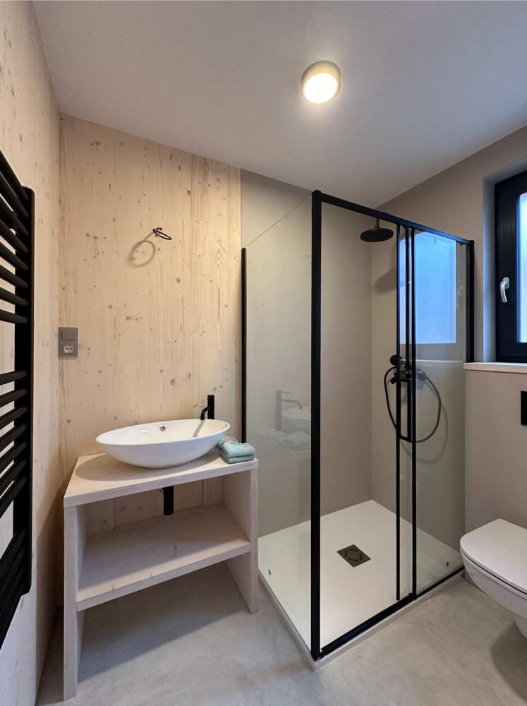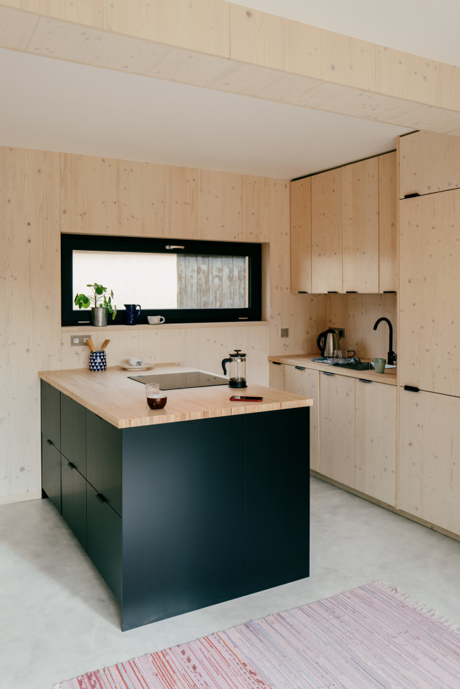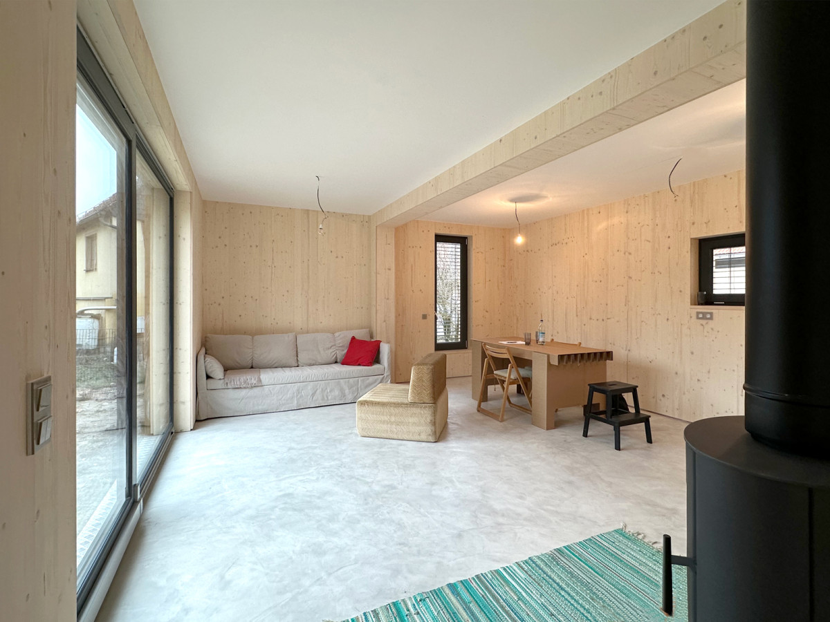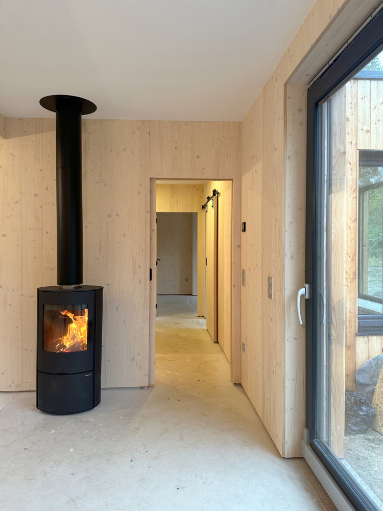 Dům je vytápěn elektrickým podlahovým topením, doplňkově pak krbovými kamny. Ohřev užitkové vody je solární, s možností využití elektřiny ze sítě ve dnech, kde je nedostatek slunečního svitu. Interiér zdobí stěny obložené smrkovou biodeskou, vyjma prostoru za sprchovým koutem, kde jsme použili velkoplošné vinylové panely v kašmírové barvě. Na podlaze je světle šedá betonová stěrka. Fasáda je provětrávaná, obložená surovým modřínem. Stavbu je realizovali na klíč, včetně založení a vybavení vestavným nábytkem. Stavební povolení vyřídil lokální architekt. Celá realizace trvala 5 měsíců.