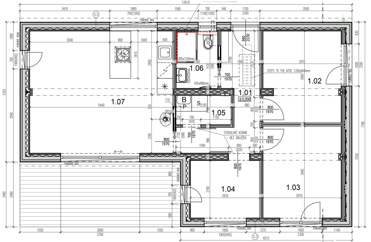 Nejvýraznější klientskou změnou je sedlová střecha se sklonem 45° rozprostírající se přes 2 moduly. Třetí poloviční modul kryje střecha plochá. Střecha poskytuje úložný prostor, je přístupná z interiéru přes skládací půdní schody zapuštěné ve stropě zádveří.