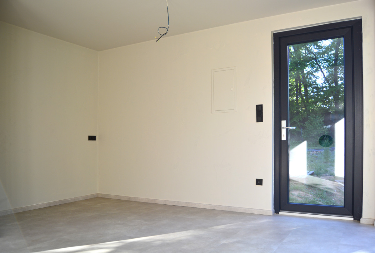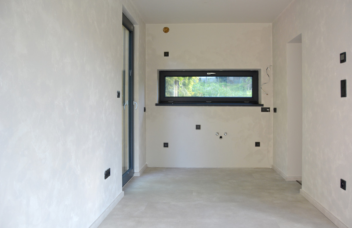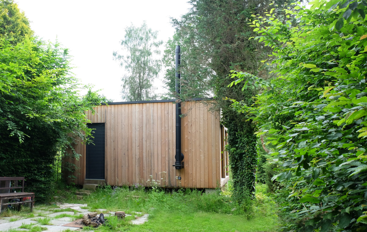 Chatka má přípravu pro krbová kamna, hlavní zdroj tepla ale zajišťuje energeticky šetrná elektrická topná folie s možností vzdáleného ovládání. Přehřívání v letním období brání kovové předokenní žaluzie. Fasádu zdobí severský modřín, který po pár letech zešedne a stavba tak opticky splyne se zahradou.