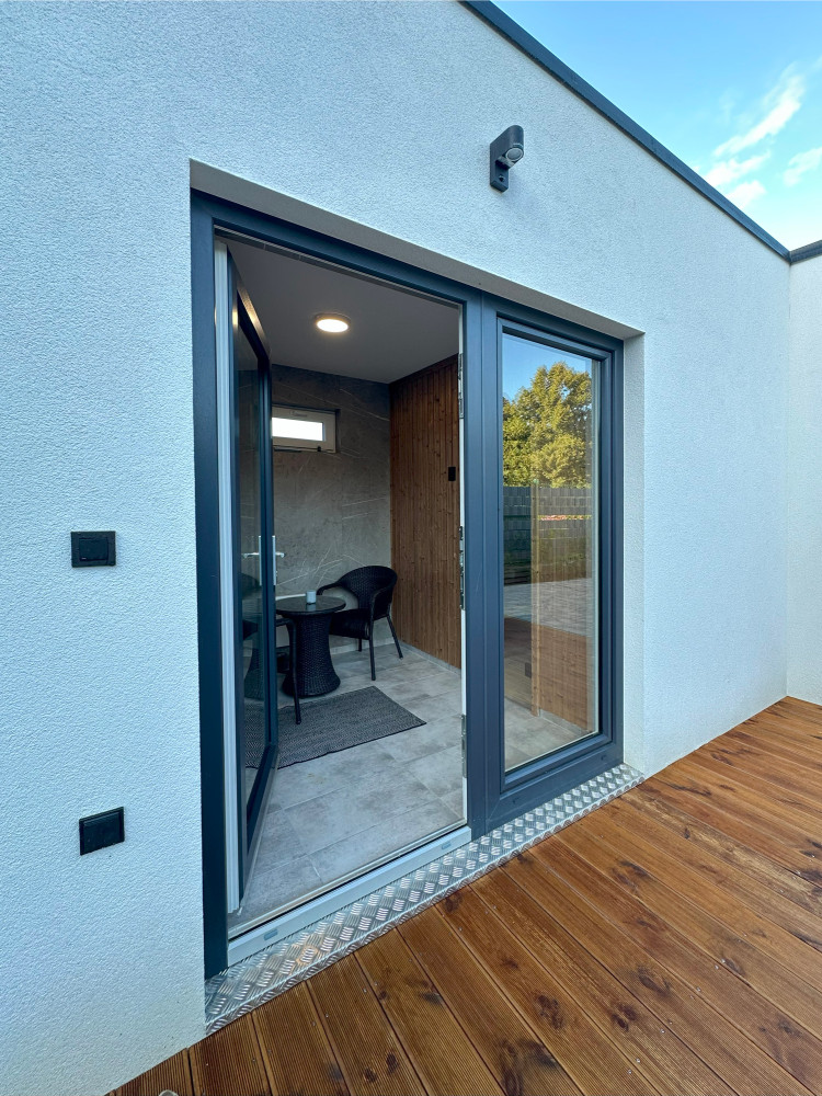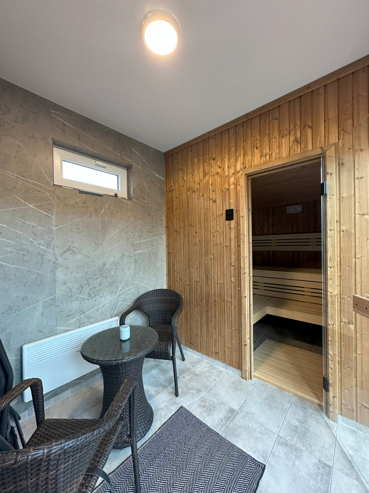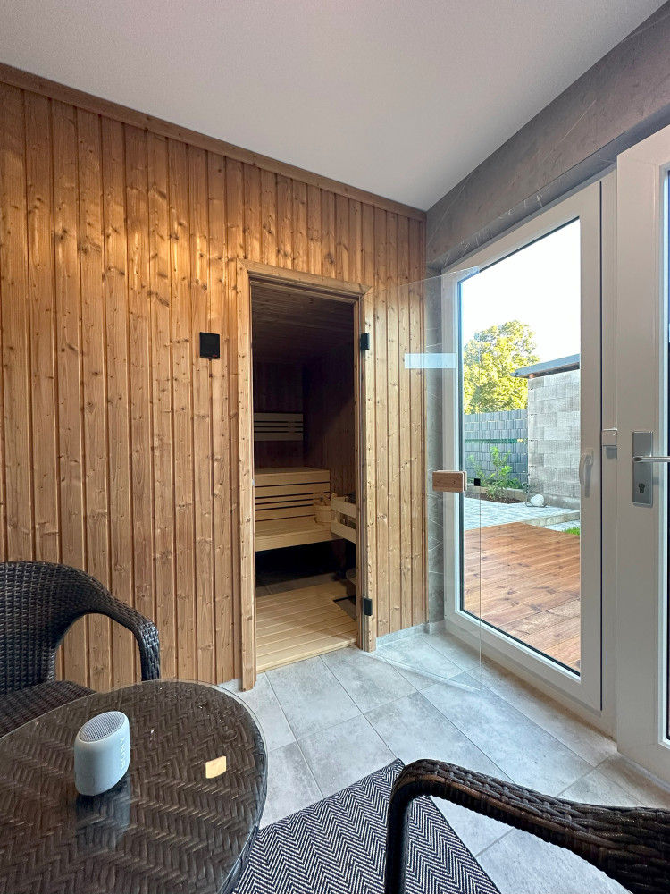Stavba byla na připravené betonové patky usazena zcela dokončená – včetně kompletně vybavené sauny