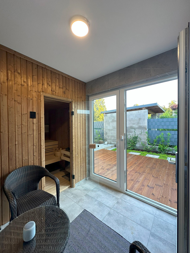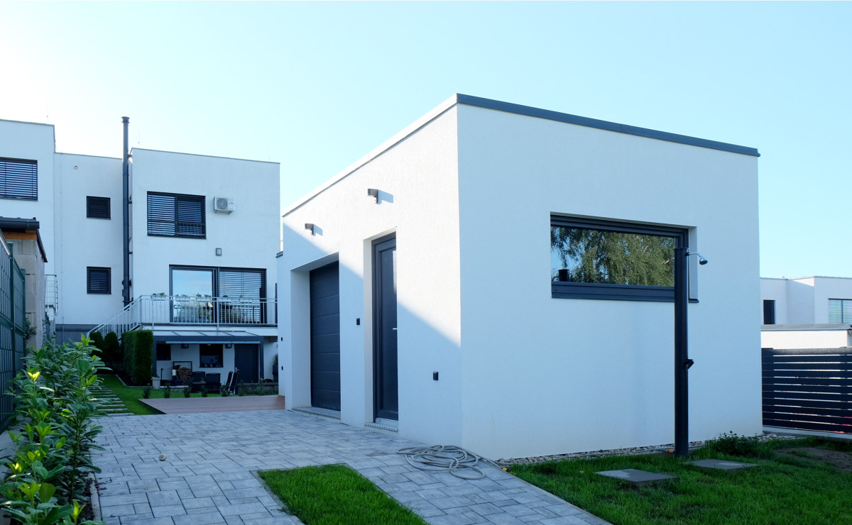 Tato individuální zakázka vznikla na základě konkrétního přání klienta: zahradní objekt, který propojí relaxaci v sauně s praktickým zázemím pro dílnu a garáž.