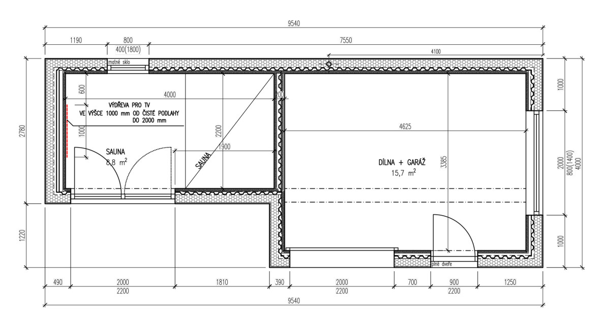 Šířka rozšířena z 2,4 m na 4 m v části garáže a dílny