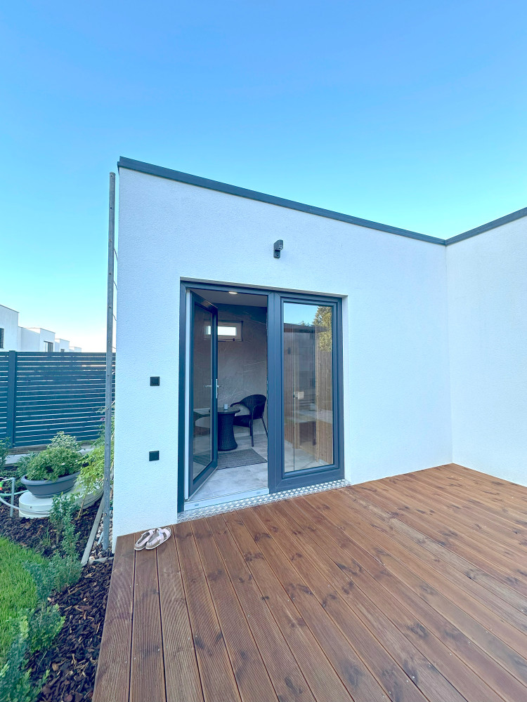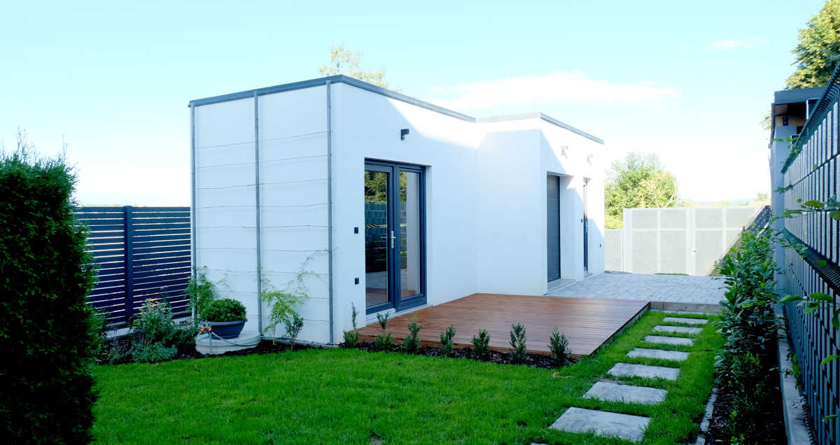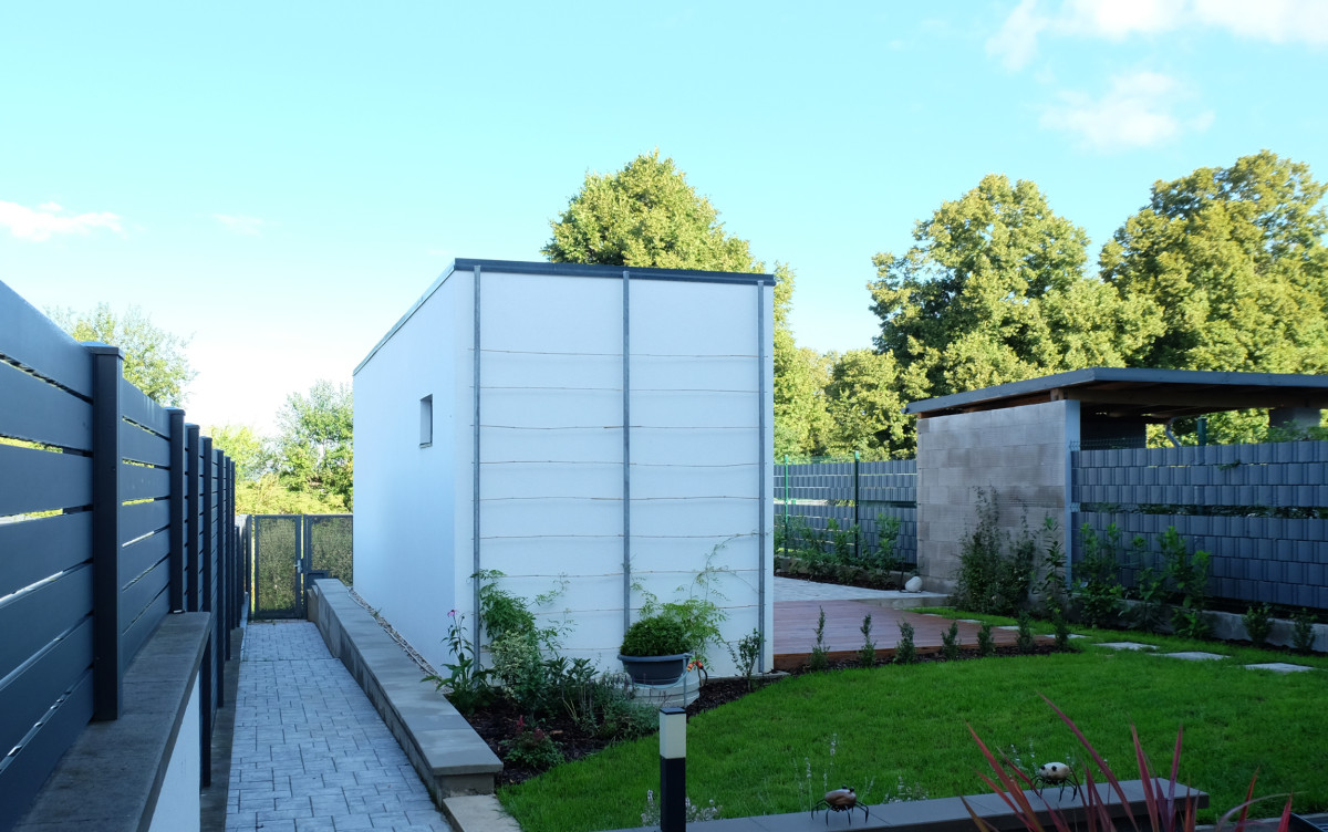 Výsledkem je elegantní zahradní domek, který svým výrazem harmonicky doplňuje moderní rodinný dům, na jehož pozemku je umístěn.