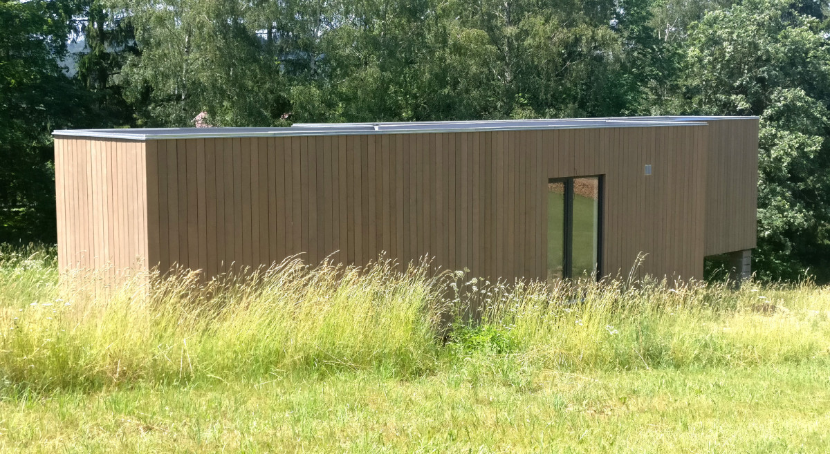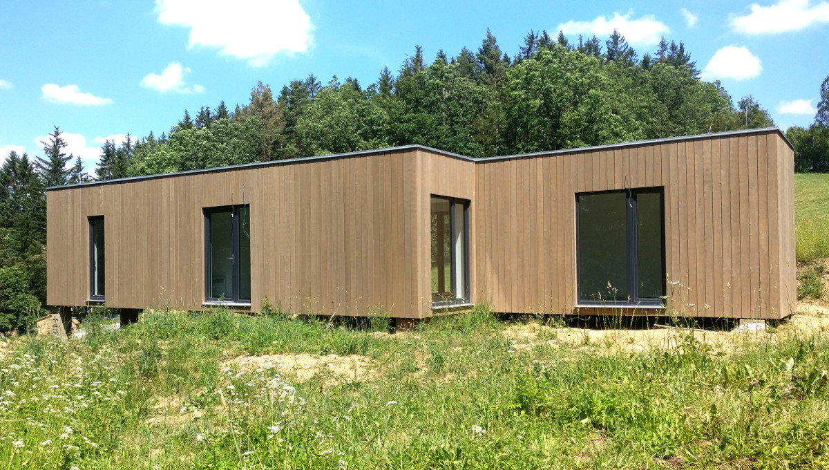 2blokki home v prodloužené variantě s šesti metrovým posunem splývá s pozemkem a dobře zapadne do budoucí permakulturní zahrady