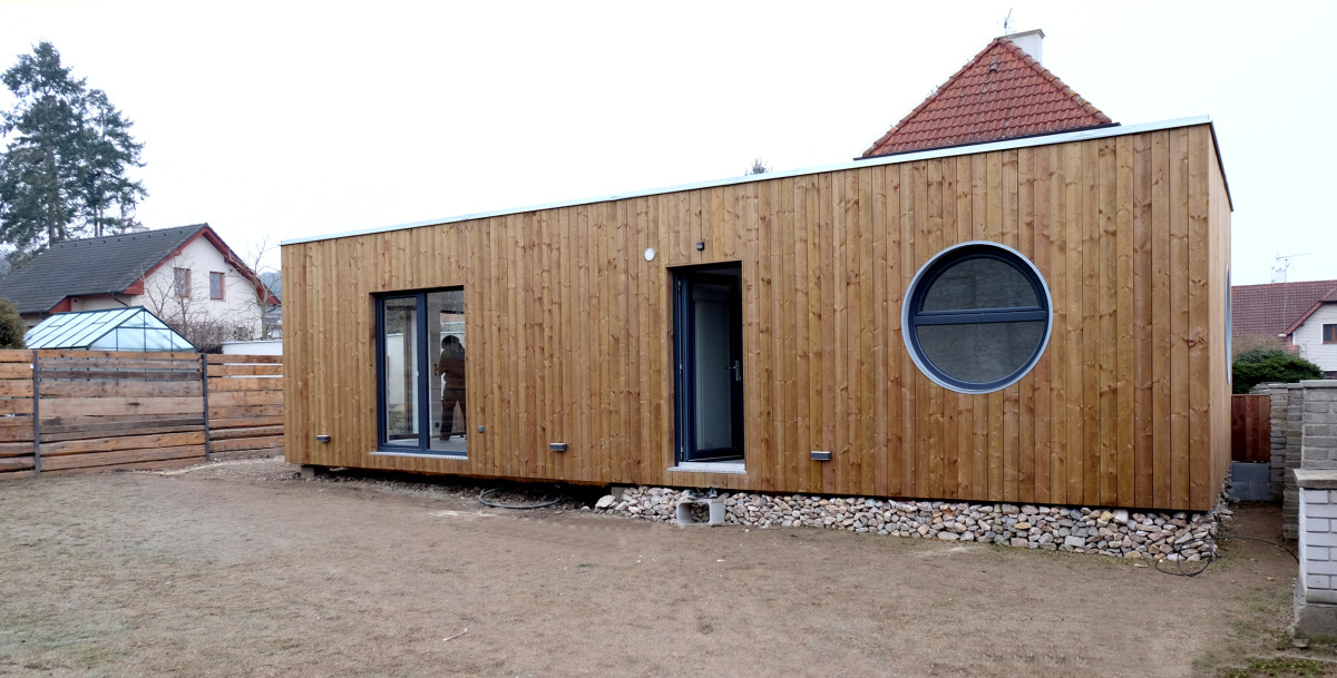 Stavba ze dvou dvanáctimetrových kontejnerů sestavených k sobě delší stranou do obdélníkového tvaru 5 x 12 m. Domek s podlahovou plochou 60 metrů čtverečních a vnitřní dispozicí 3kk zdobí dvě kulatá okna o průměru 140 cm. Obytný prostor je příjemně prosklený, velká okna směrují do zahrady a opticky zvětšují vnitřní prostor.